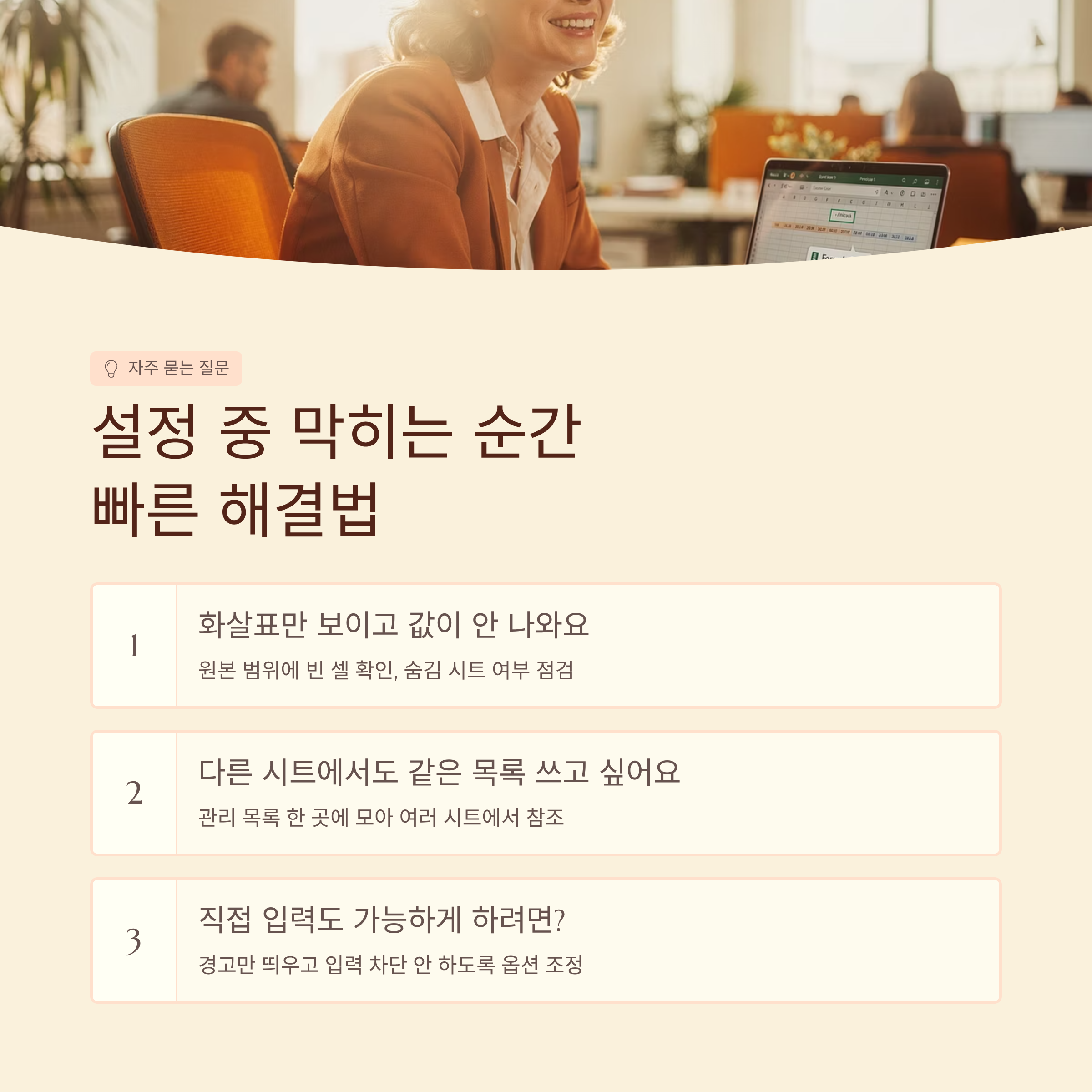 Q. 직접 타이핑도 허용하고 싶은데 방법이 있을까요? A. 경고 메시지만 띄우고 입력 자체는 막지 않도록 옵션을 조정하면, 목록 외의 값도 일단 받아들이게 설정할 수 있어요.