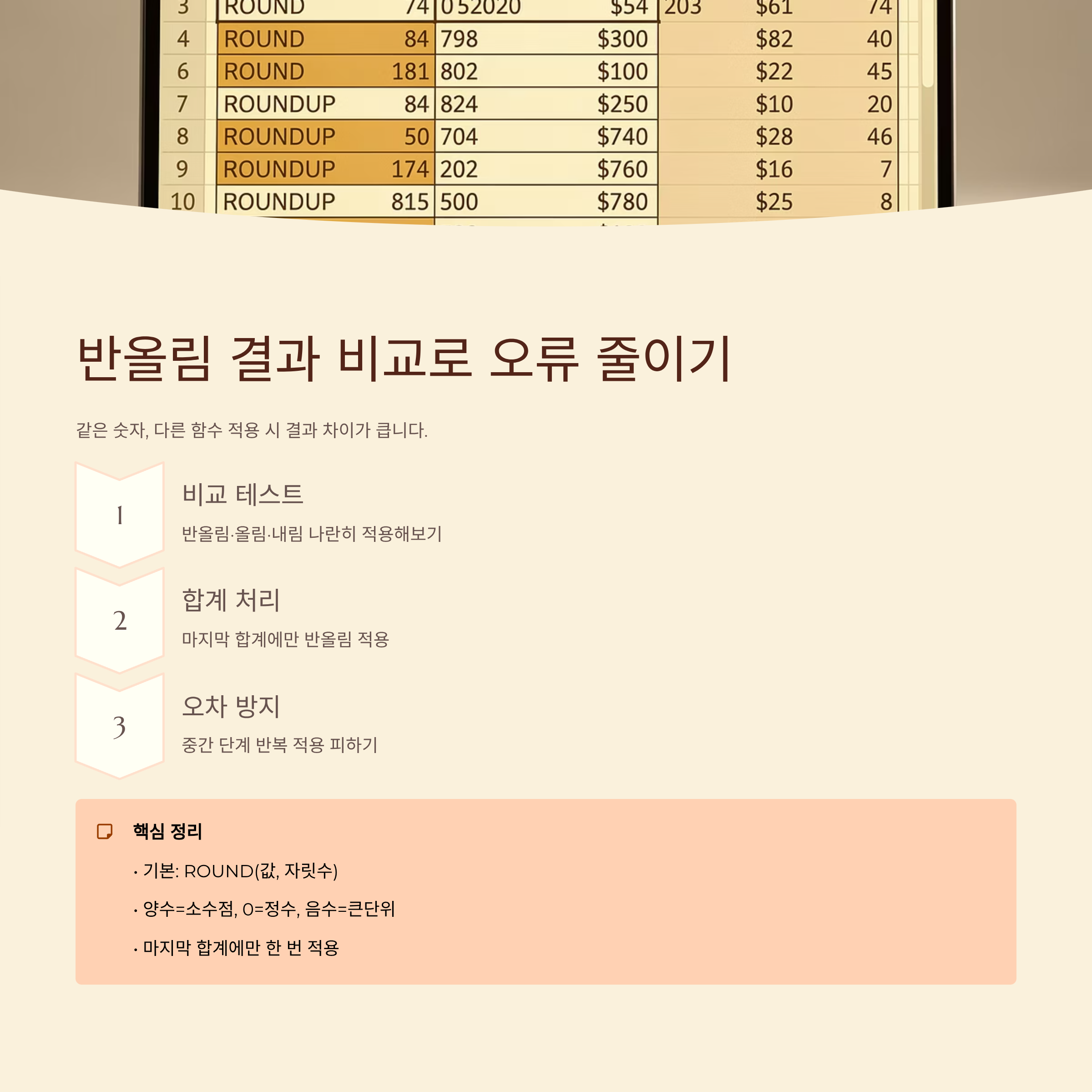 또 합계처럼 여러 값을 더한 결과가 중요한 경우에는, 각각의 값에 함수를 걸지 말고 마지막 합계에만 반올림을 적용해 보는 것도 방법이에요. 중간 단계에서 자꾸 자릿수를 줄이면 미세한 오차가 쌓일 수 있거든요. 이렇게 계산 흐름을 한 번 점검해 보면 결과를 더 믿고 사용할 수 있어요.