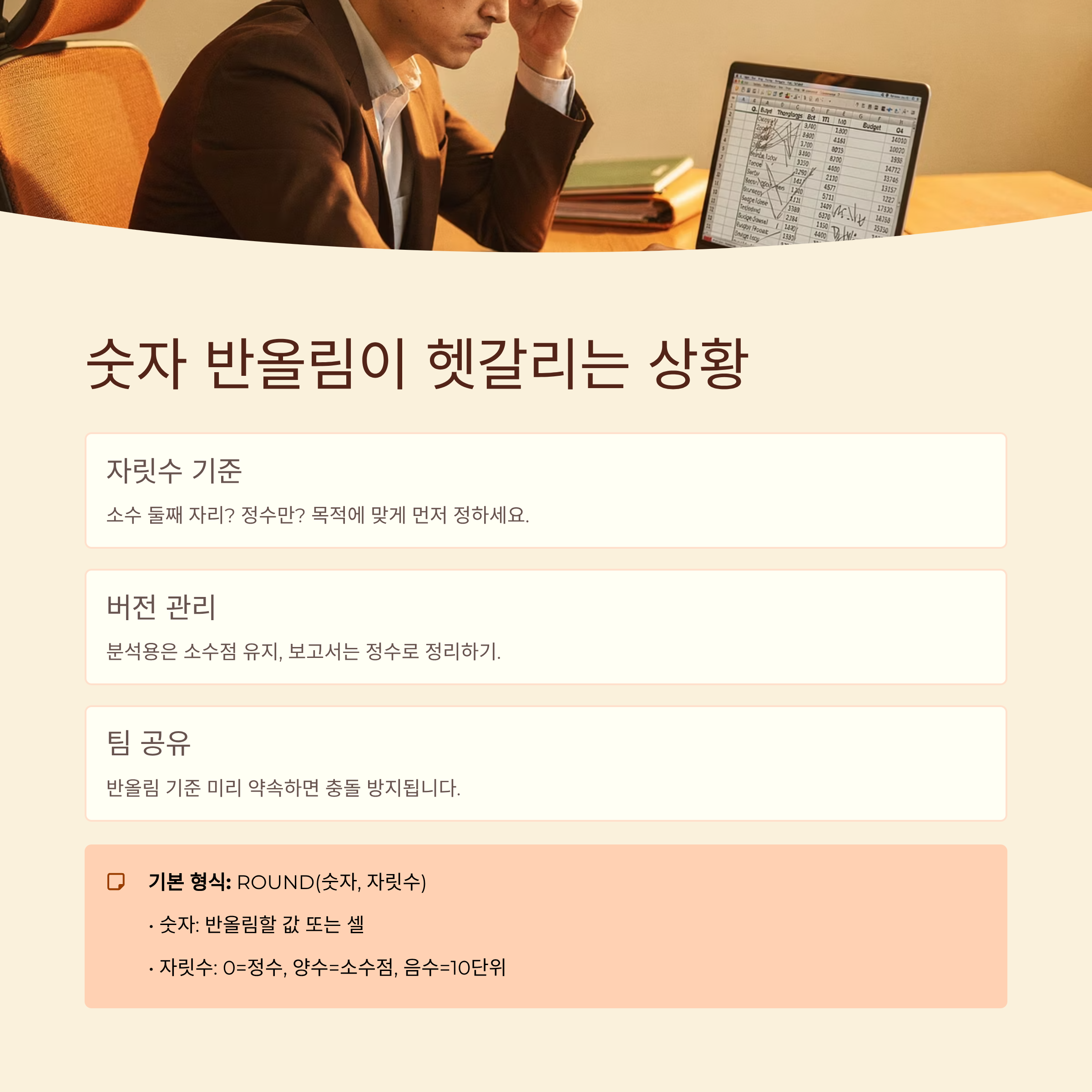 숫자를 정리할 때 제일 먼저 막히는 게 어디까지 반올림해야 할지 정하는 부분이더라고요. 소수 둘째 자리까지 보여 줄지, 정수만 남길지에 따라 인상이 완전히 달라지거든요. 그래서 보고서 목적에 맞게 자릿수를 먼저 정해 두면 나중에 계산식을 수정할 일이 훨씬 줄어들어요.