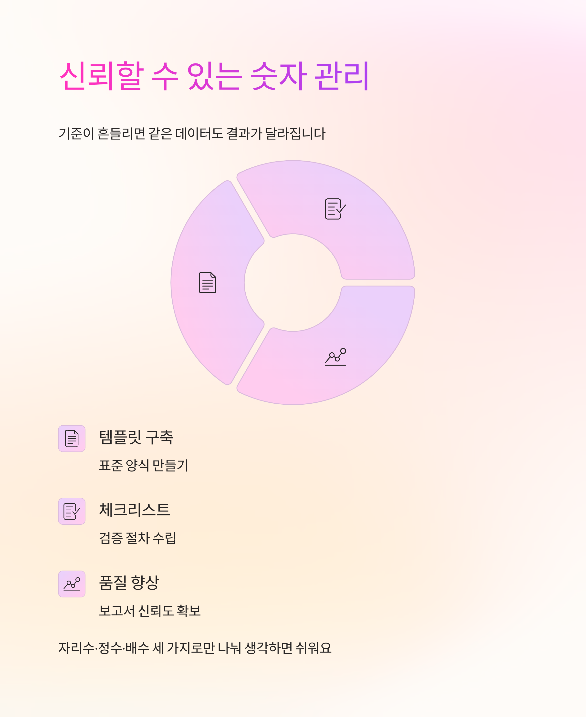 숫자를 다루는 일은 결국 신뢰의 문제예요. 기준이 흔들리면 같은 데이터도 결과가 달라지고, 팀은 금방 피로해져요. 오늘 정리한 선택 흐름을 템플릿과 체크리스트로 묶어두세요. 자리수·정수·배수 세 가지로만 나눠 생각하면 웬만한 계산은 곧장 풀립니다. 몇 번만 반복해도 손이 먼저 움직이고, 보고서 품질은 자연스럽게 올라가요.
