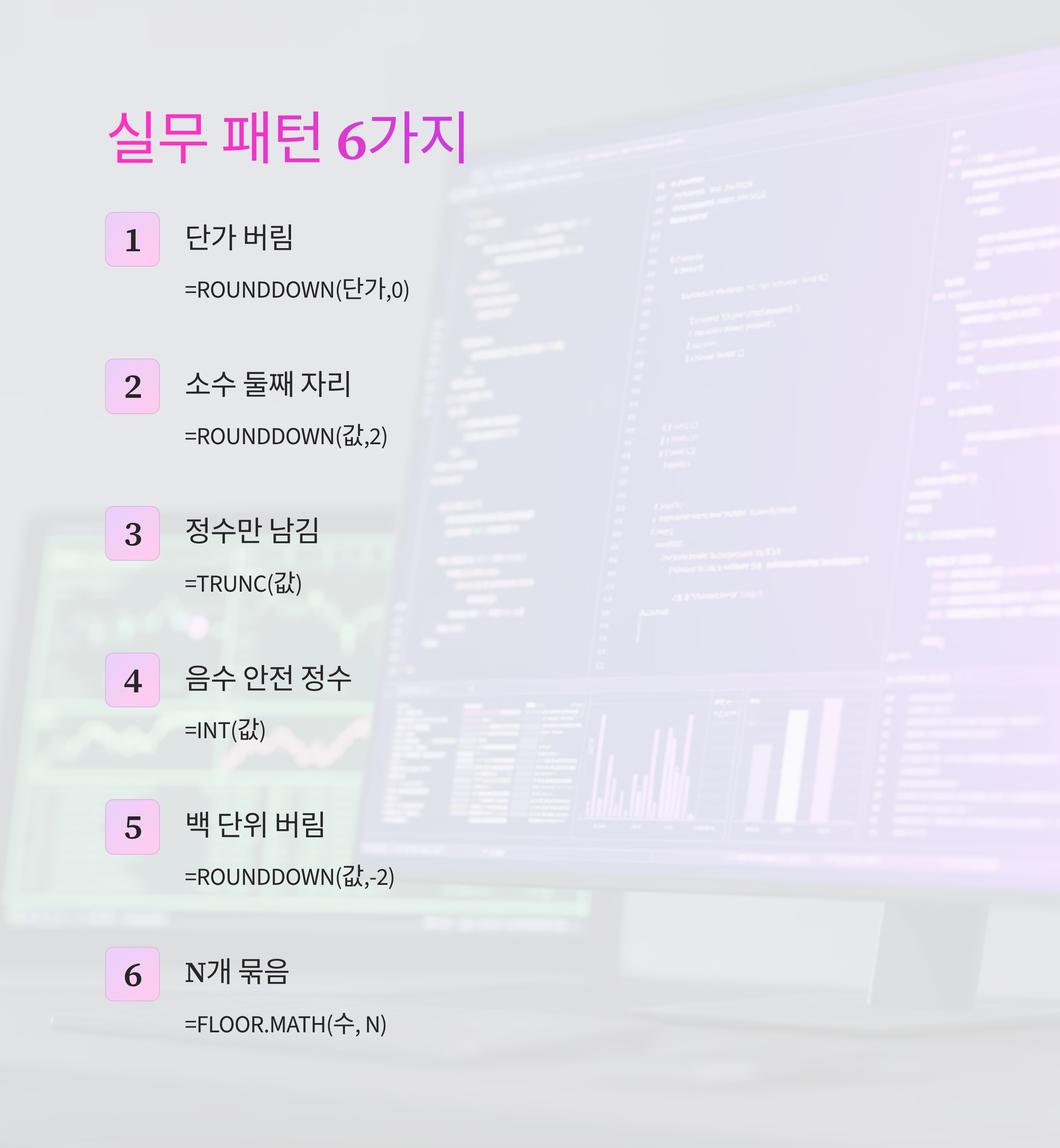① 단가 버림: =ROUNDDOWN(단가,0) ② 소수 둘째 자리: =ROUNDDOWN(값,2) ③ 정수만: =TRUNC(값) ④ 음수 안전 정수: =INT(값) ⑤ 백 단위: =ROUNDDOWN(값,-2) ⑥ N개 묶음: =FLOOR.MATH(수, N). 현장에서 가장 자주 쓰는 서식은 이 정도면 충분해요.