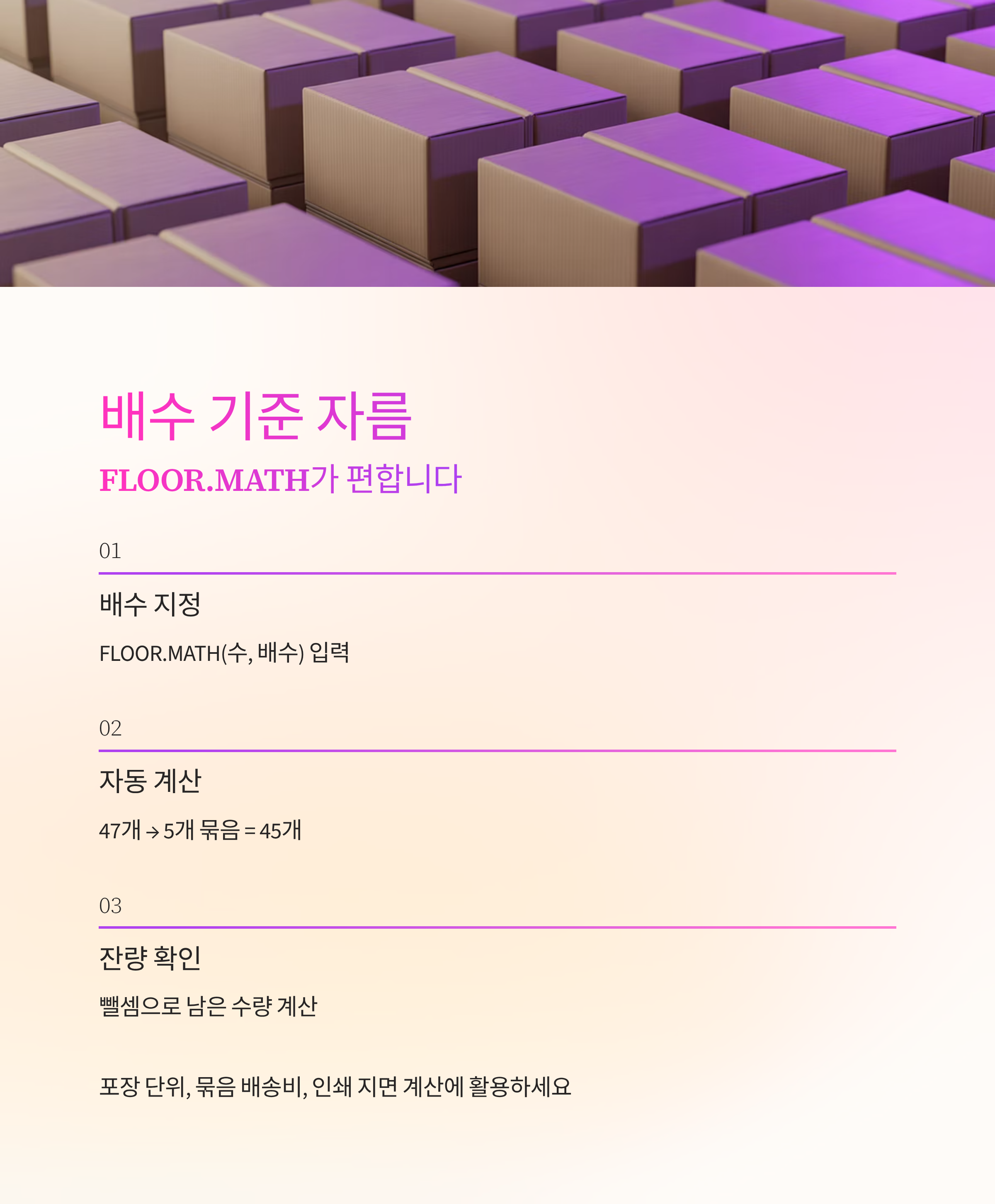 단가×수량처럼 포장 단위로 끊어야 할 땐 배수로 자르는 게 깔끔해요. FLOOR.MATH(수, 배수)는 지정 배수 이내로 내림해 주고, CEILING.MATH는 위쪽으로 올려 붙여요. 47개를 5개 묶음으로 계산하면 FLOOR.MATH(47,5)=45가 되고, 남는 수량은 뺄셈으로 구하면 끝이에요.