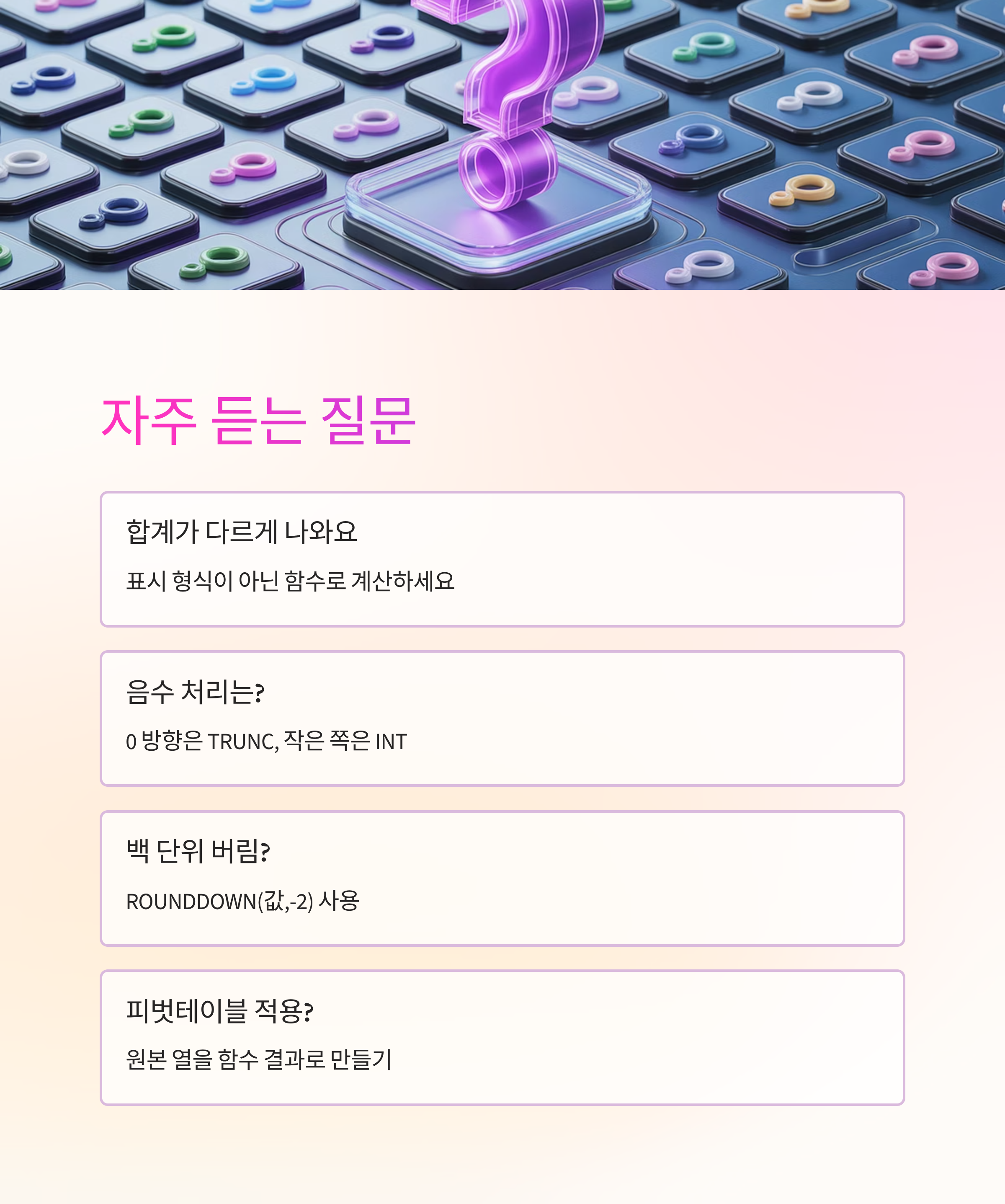 대량 처리라면 파워쿼리에서 ‘정수로 변환/자릿수 반올림’ 단계를 조합해 동일한 결과를 얻을 수 있어요. 데이터가 계속 들어오는 파일은 쿼리 갱신만으로 자동 적용되니 관리가 쉬워요. 표준 템플릿엔 입력·계산·출력 시트를 분리하고, 합계 셀에는 조건부 서식으로 이탈값을 표시해요.