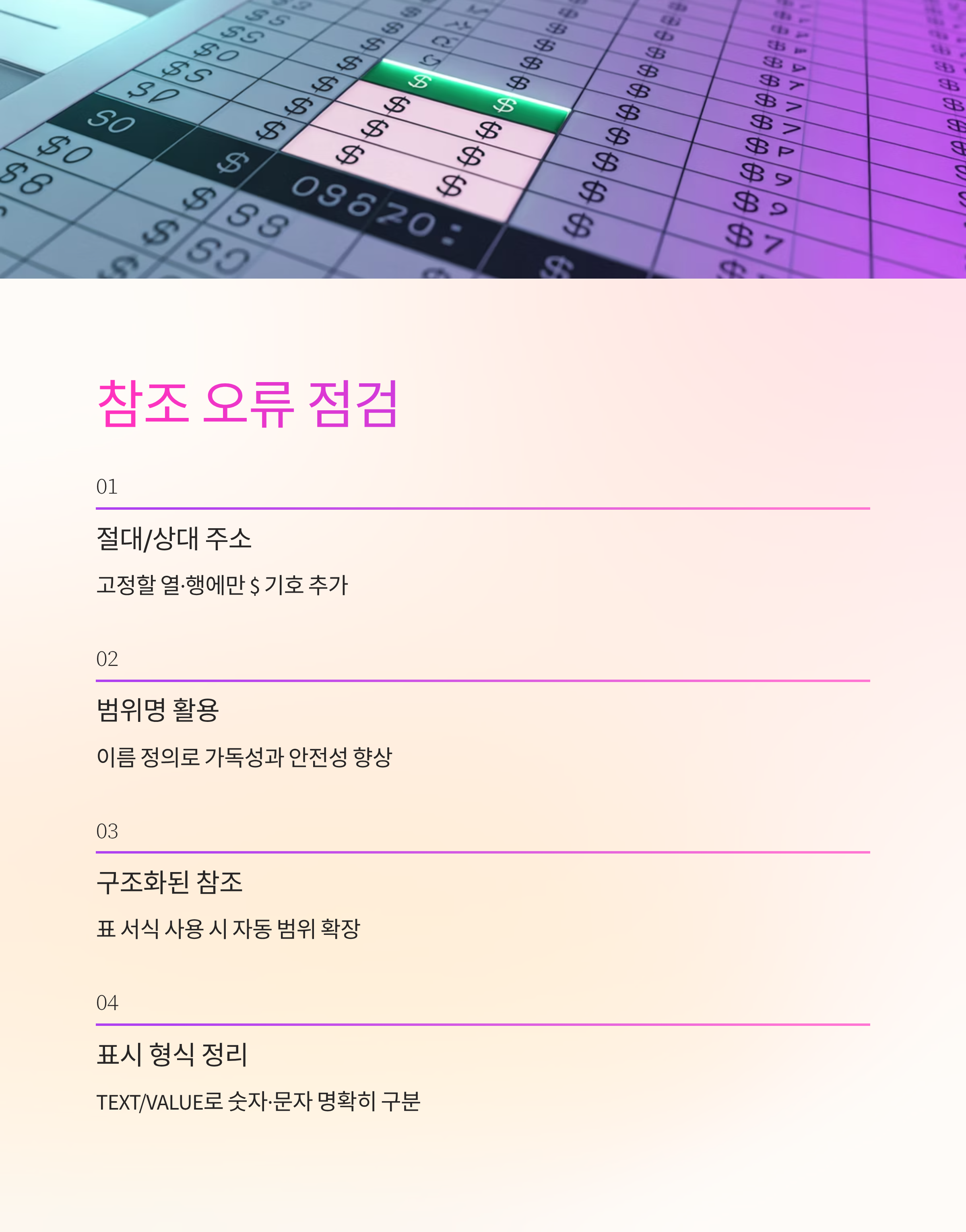 다음은 참조 오류 점검이에요. 복사 후 값이 이상하면 절대/상대 주소가 엇갈린 거예요. 고정해야 할 열·행에만 $를 붙이고, 범위명(이름 정의)을 쓰면 가독성과 안전성이 함께 올라가요. 구조화된 참조(표 서식)를 쓰면 행이 늘어나도 자동으로 범위가 따라붙어요.