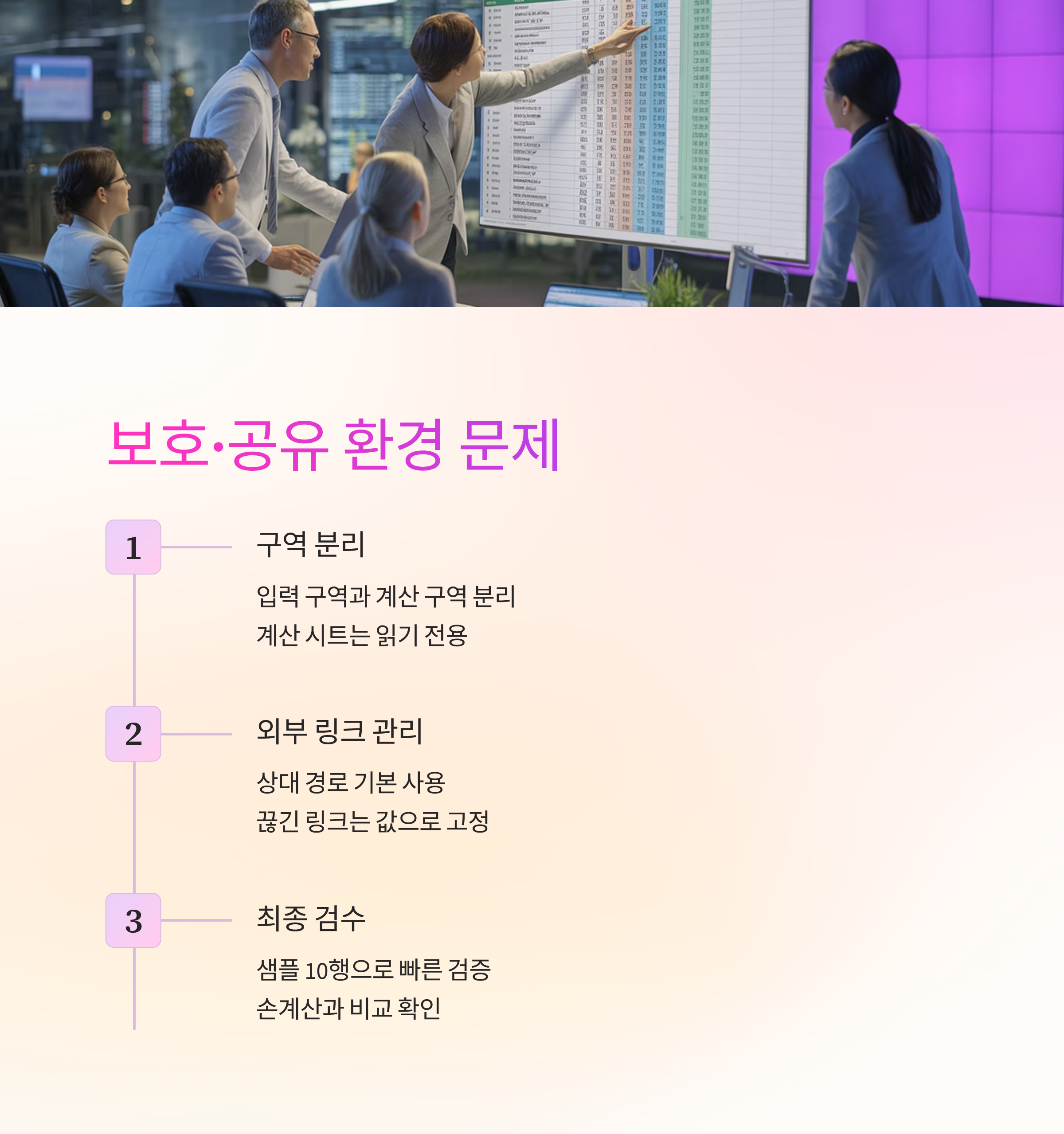 최종 검수는 샘플 10행으로 빠르게 돌려요. 합계·평균·최댓값을 손계산과 비교하고, 조건부 서식이 계산에 끼어드는지도 봐요. 검수표 마지막 칸에 엑셀수식안됨 해결 여부를 체크해 다음 사람에게 넘기면 협업 속도가 올라가요.