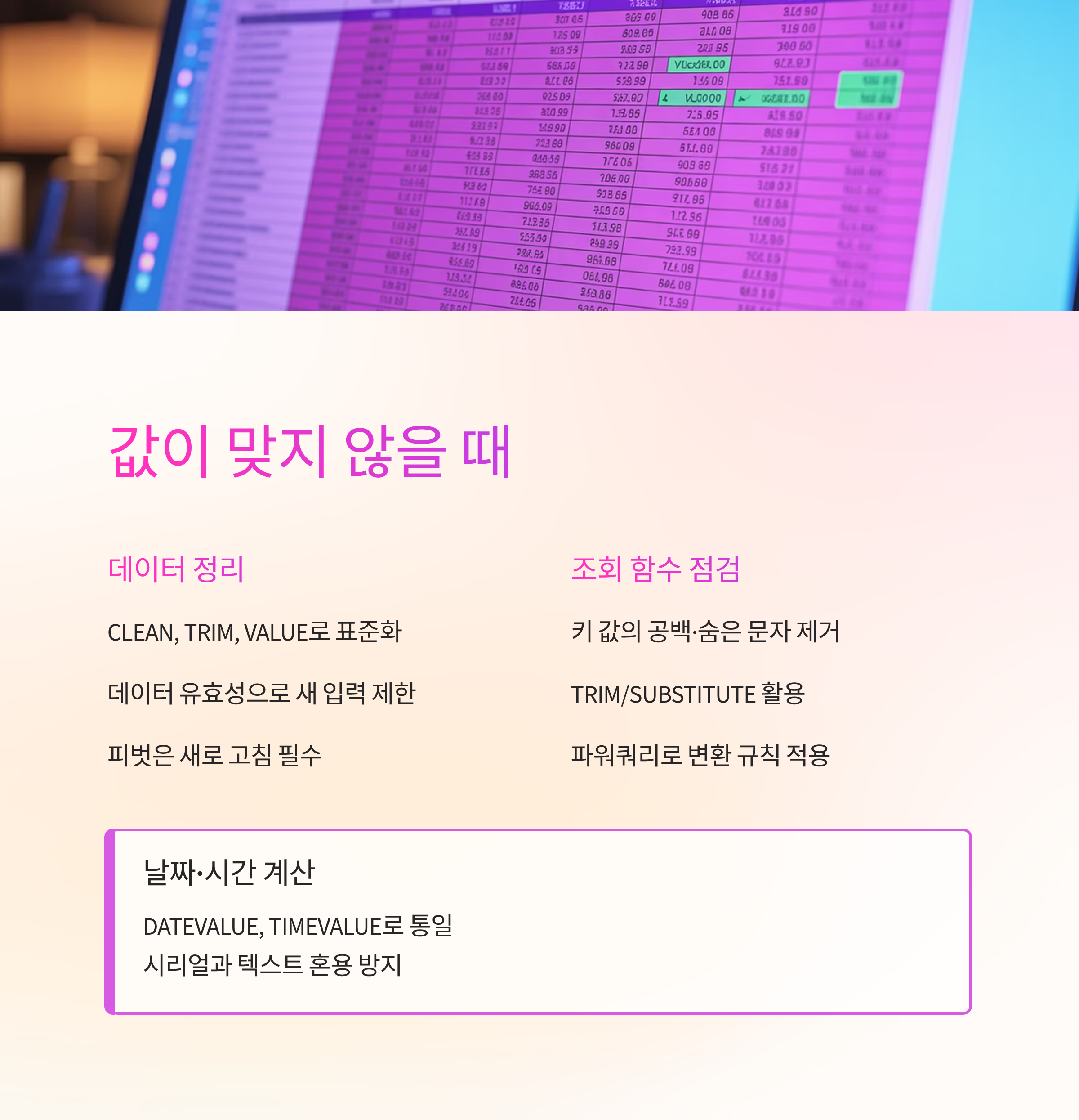 마지막으로 표시 형식을 봐요. 날짜가 숫자로 보이거나 반대로 날짜처럼 계산될 때가 있죠. TEXT와 VALUE로 한 번 고정해주거나, 원본을 정리해 숫자·문자를 확실히 나누면 혼란을 줄일 수 있어요. 특히 합계가 0이 되는 건 공백 문자가 숨어 있는 경우가 많아요.