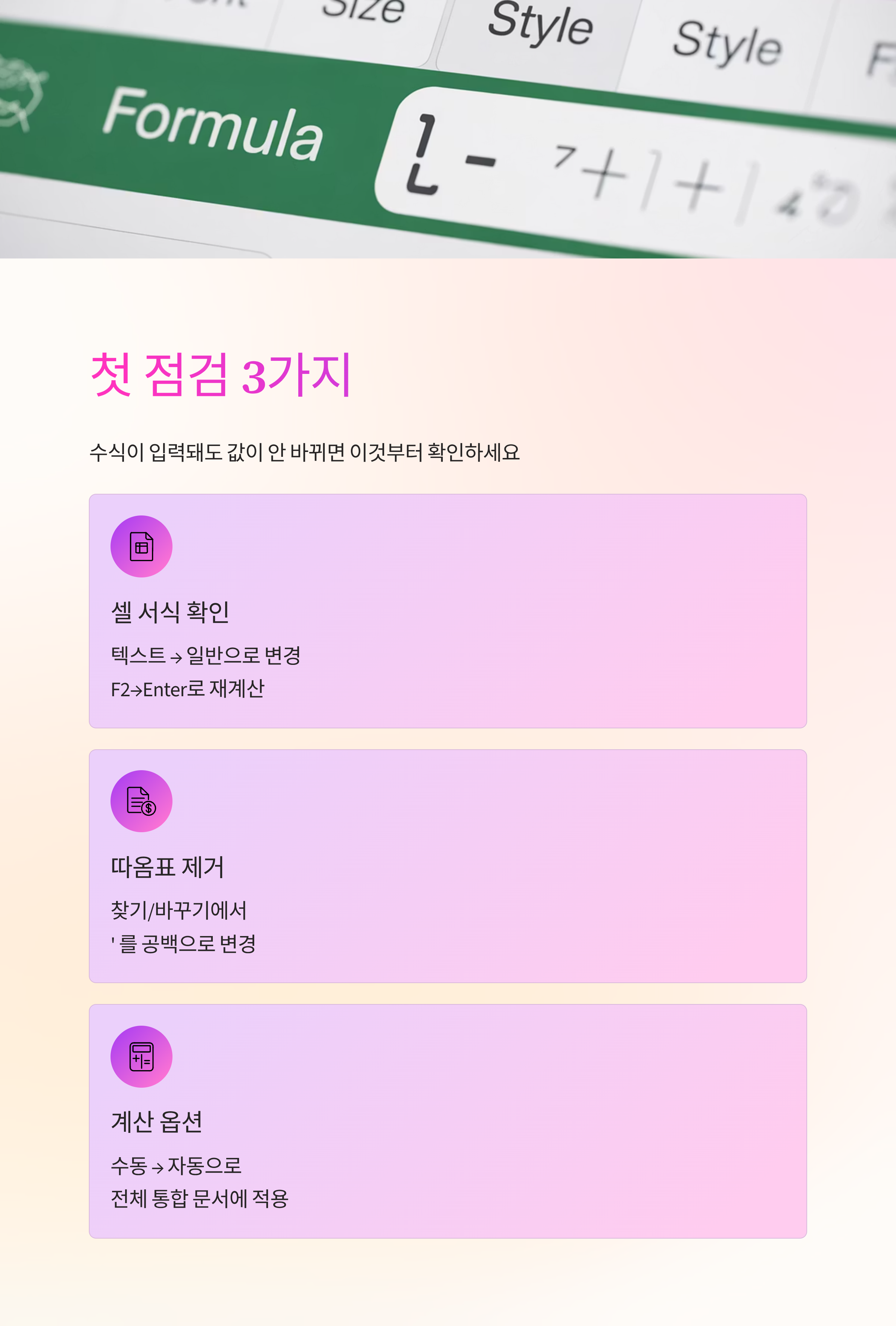 수식이 말을 안 들 때 대부분은 설정 한두 가지가 어긋난 거더라고요. 오늘 체크리스트대로만 훑어보면 원인이 금방 드러나서, 괜히 파일 전체를 의심하지 않아도 돼요. 작은 습관 몇 가지만 바꿔도 보고서 마감이 훨씬 덜 급해져요. 다음에 비슷한 증상이 오면 당황하지 말고, 문제를 세 칸으로 나눠 차분히 확인해보세요. 금방 풀릴 거예요.