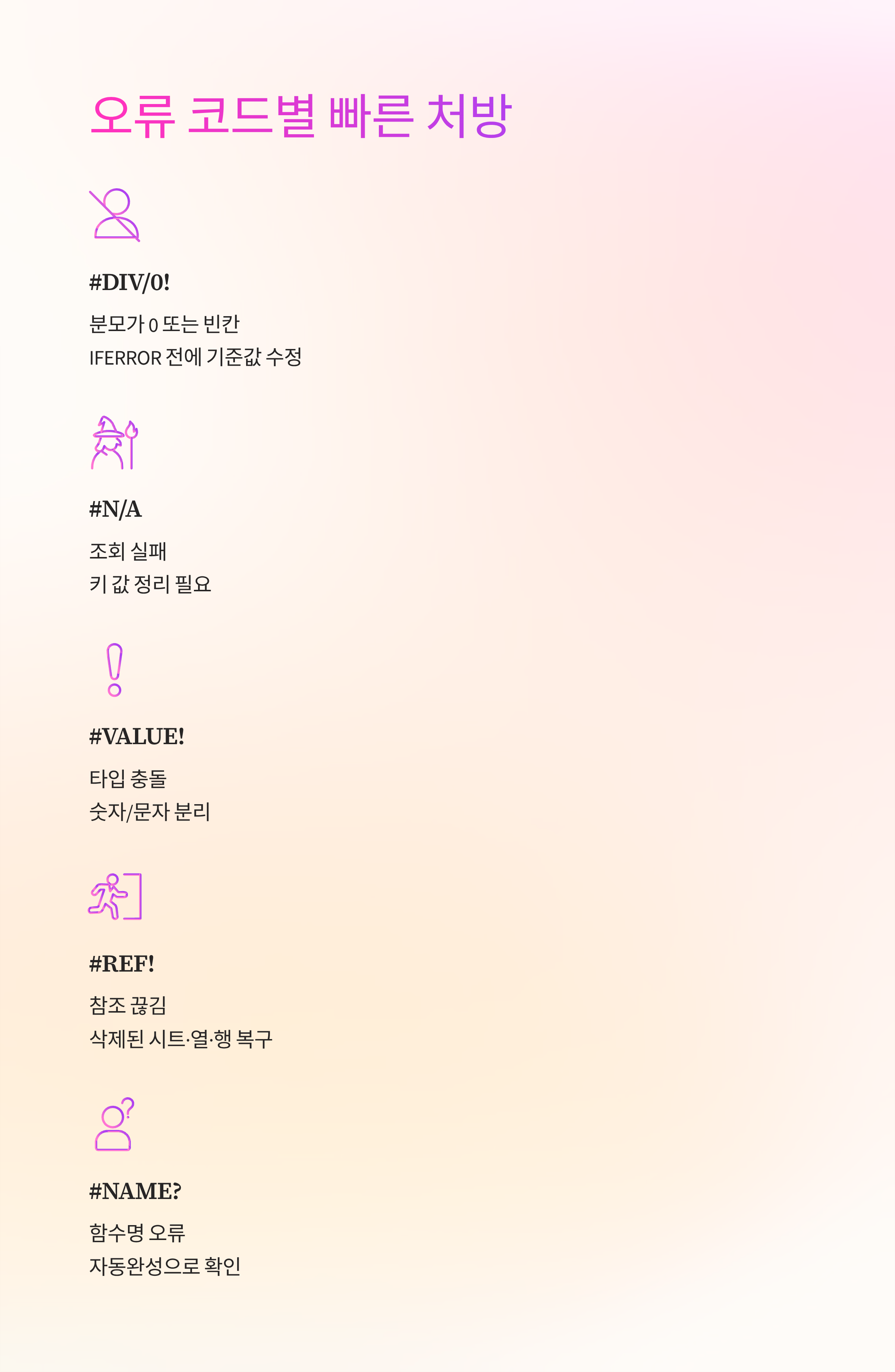 #DIV/0!은 분모가 0이거나 빈칸이라서 그래요. IFERROR로 보기 좋게 가리기 전에, 기준을 0이 아닌 값으로 바꾸는 게 먼저예요. #N/A는 조회 실패니 키 값을 먼저 정리해요. #VALUE!는 타입 충돌이라 숫자/문자를 분리하면 금방 풀려요.
