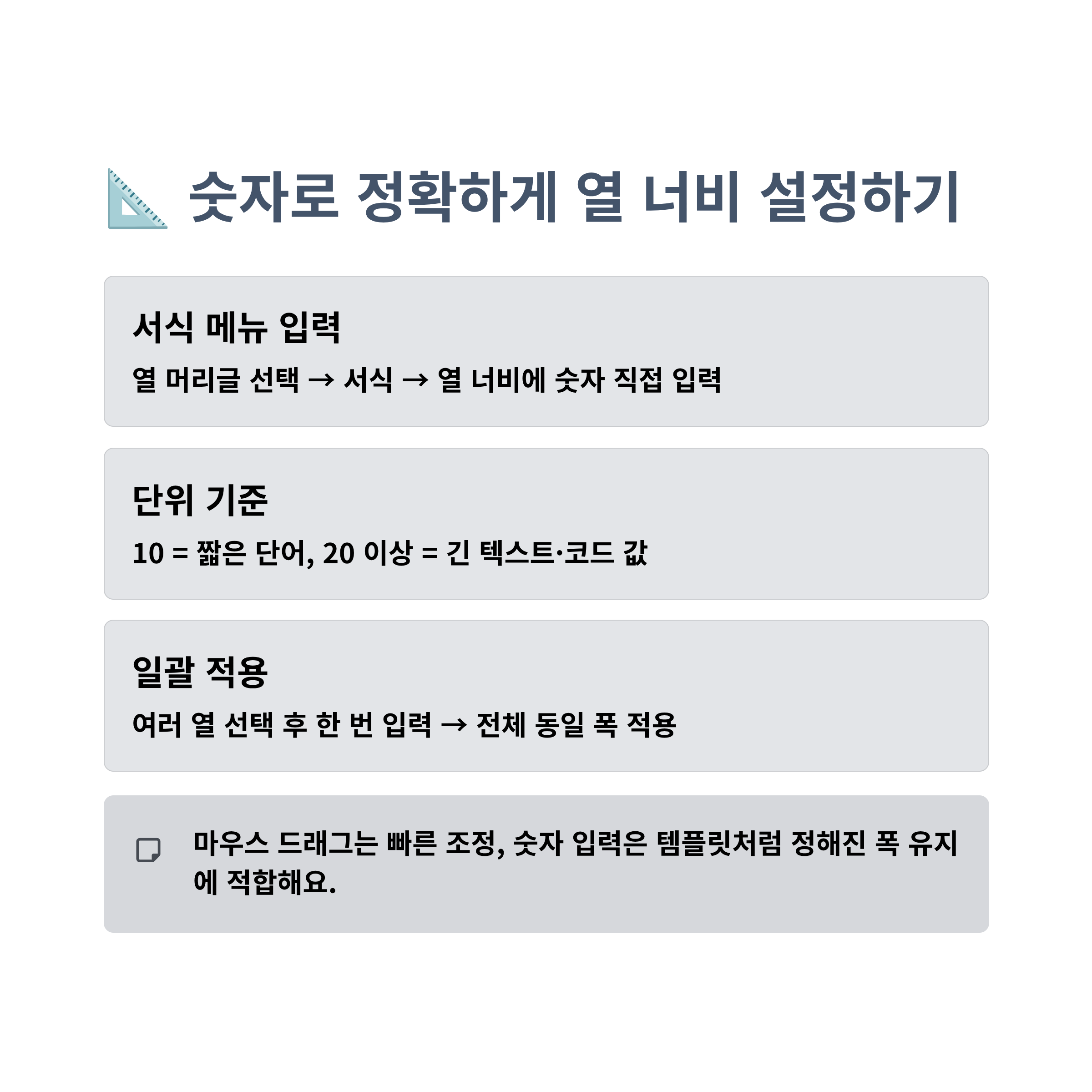 마우스 드래그는 눈으로 보며 빠르게 조정할 때, 숫자 입력은 보고서 템플릿처럼 정해진 폭을 유지할 때 적합해요.