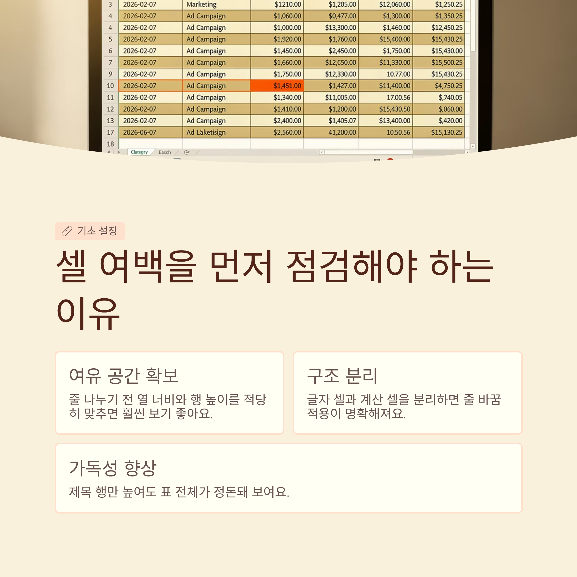 줄 간격이 너무 붙어 있으면 줄을 나눠도 답답해 보일 수 있으니, 셀 위·아래 여백도 함께 조절해 보세요. 필요하면 글자 크기를 살짝 줄이고 행 높이를 넓혀 보는 것도 방법이에요. 아래 요약 표를 참고하면서 내 문서에 어울리는 기준을 한 번 만들어 보시면 도움이 될 거예요.