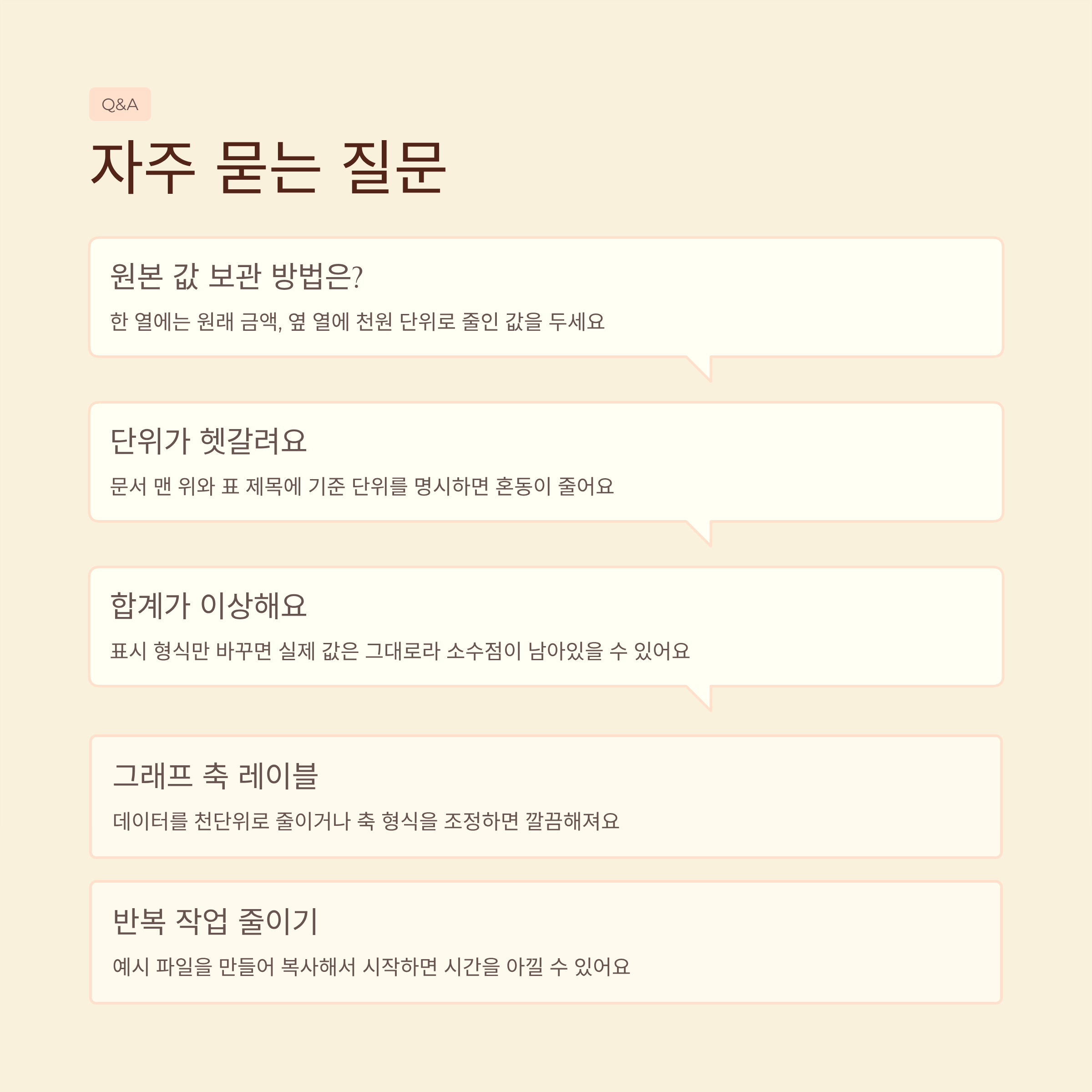 A1. 한 열에는 원래 금액을 두고, 옆 열에 천원 단위로 줄인 값을 두면 비교와 계산을 상황에 따라 다르게 선택할 수 있어요.