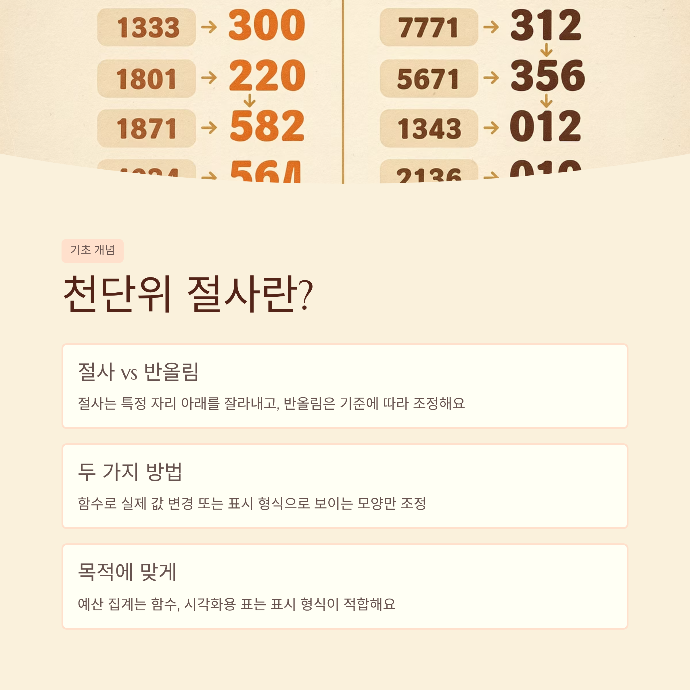 자주 쓰는 함수로는 내림 기능과 정수만 남기는 기능이 있어요. 또, 숫자를 1,000으로 나눈 뒤 정수 부분만 남기고 다시 1,000을 곱해서 자릿수를 줄이는 방식도 많이 활용해요. 어떤 방법을 쓰든, 원본 값을 따로 보관해 두는 습관을 들이면 나중에 기준을 바꿔야 할 때도 유연하게 대응할 수 있어요.