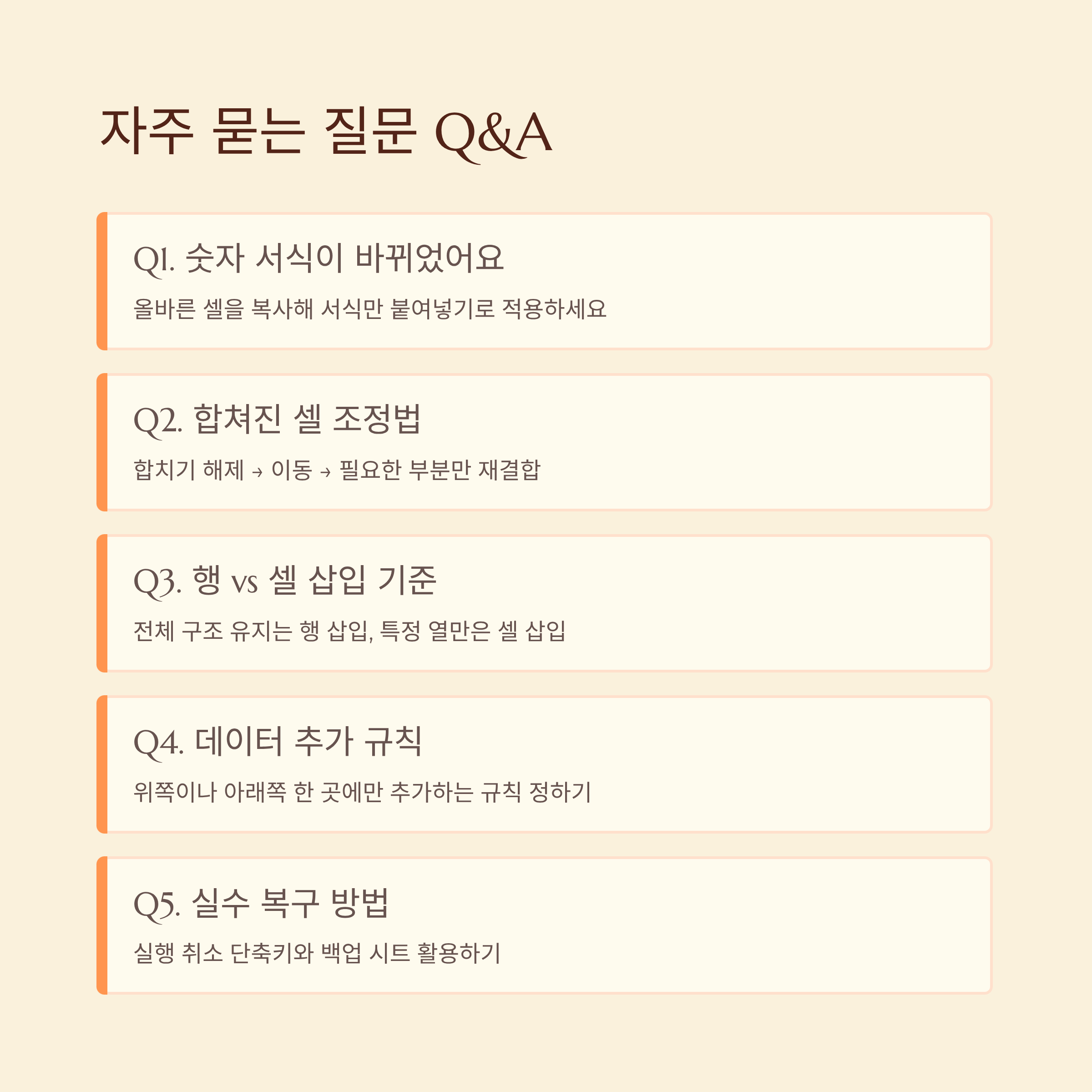A5. 실행 취소 단축키와 함께, 편집 전 원본 시트를 하나 복사해 두는 습관을 들이면 마음 편하게 수정하실 수 있어요.