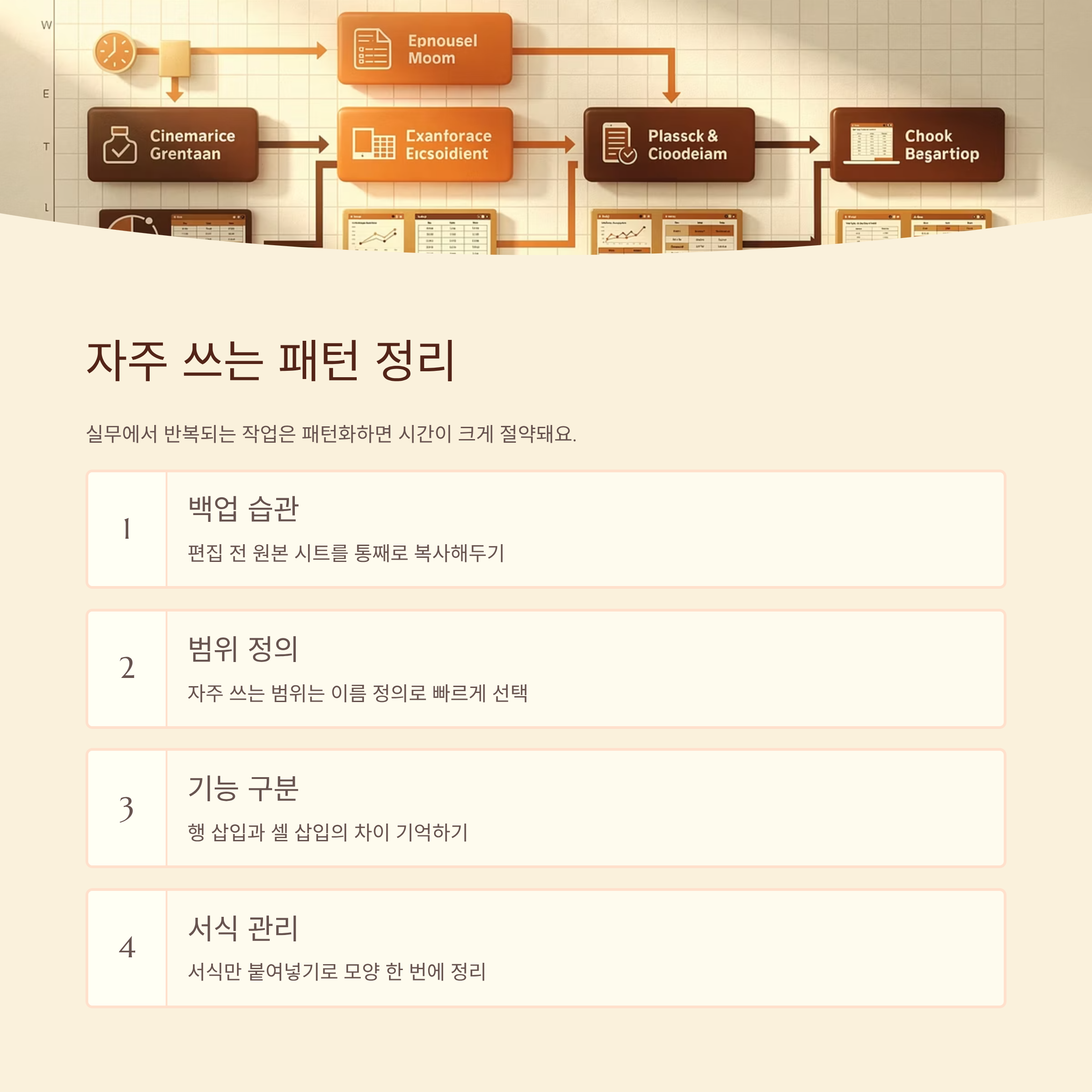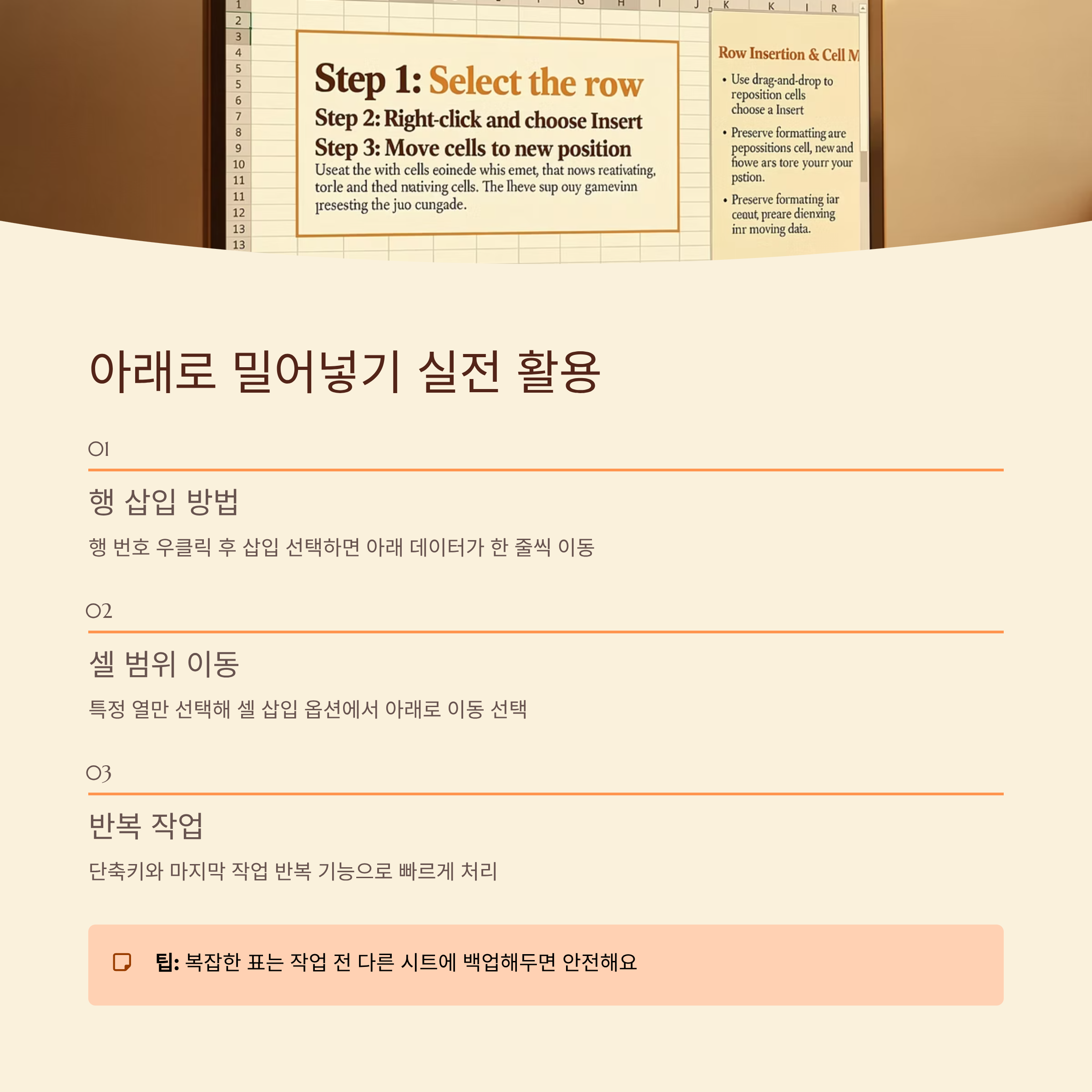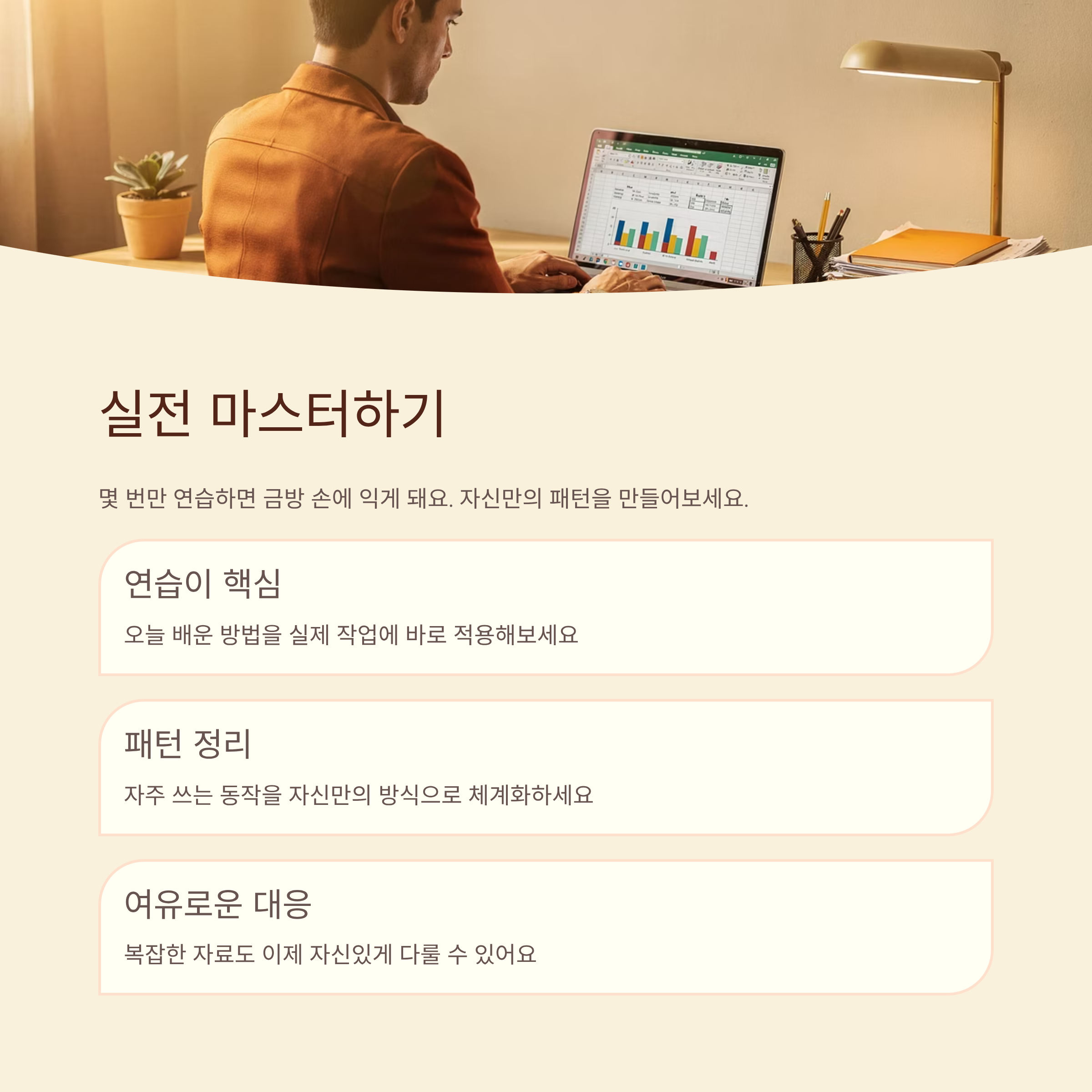 실무에서는 비슷한 패턴으로 셀 위치를 바꾸는 일이 반복돼요. 예를 들어 주간 보고서에서 이번 주 데이터를 아래쪽에 차례대로 추가하거나, 월별 통계를 위에서 아래로 쌓는 식이죠. 이럴 때는 매번 고민하기보다 자신만의 기본 패턴을 정해 두면 훨씬 편해요. 예를 들어 새 데이터를 항상 맨 위에 넣을지, 맨 아래에 이어붙일지 기준을 하나로 통일해 보는 거예요.