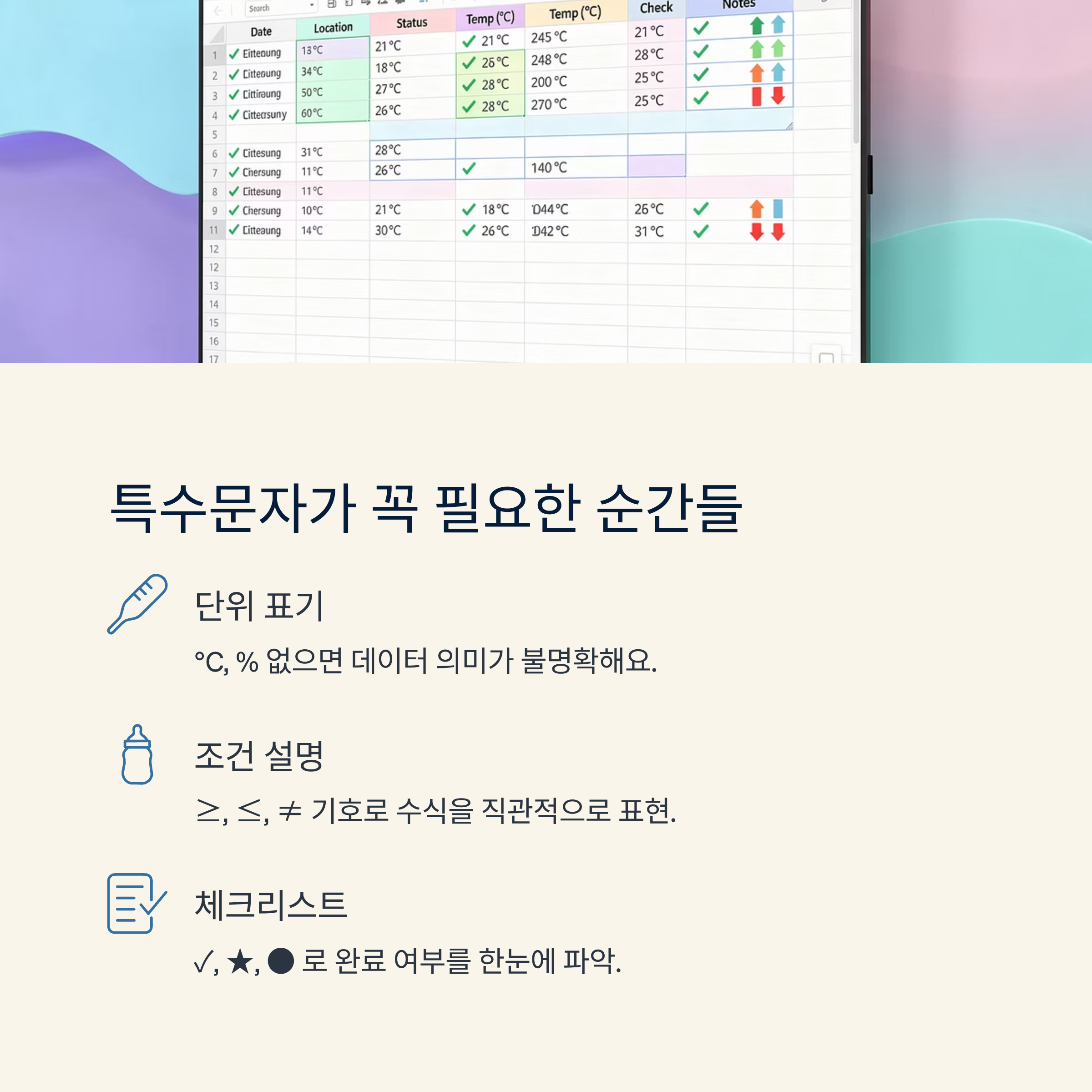 온도 기호(°), 퍼센트(%), 더하기/빼기 기호, 화살표, 체크 표시처럼 숫자만으로 설명이 부족할 때 직관적으로 의미를 전달해 줘요.