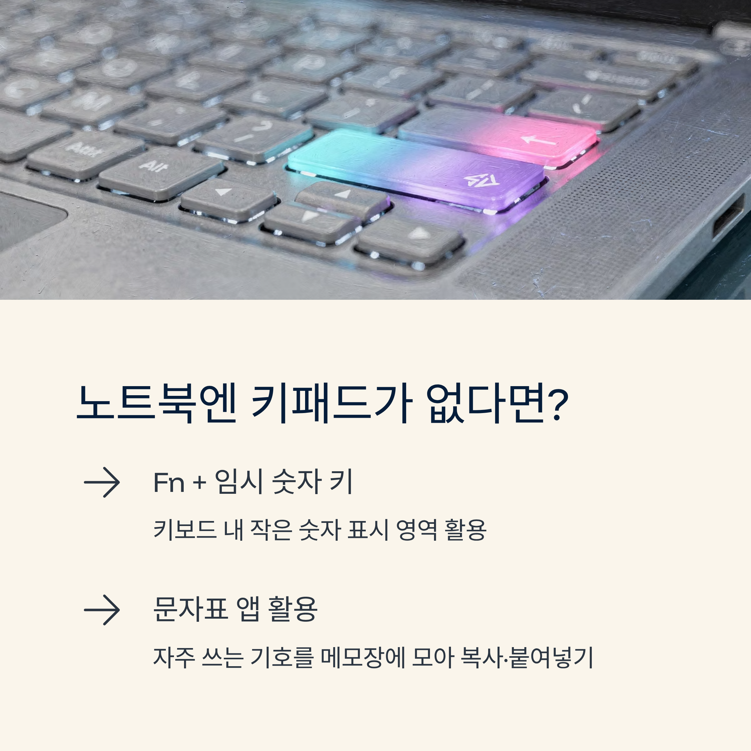 | 노트북이라 숫자 키패드가 없을 때는 어떻게 입력하나요? | Fn+임시 숫자 키를 활용하거나, 문자표·메모장에 자주 쓰는 기호를 모아두고 복사·붙여넣기하는 방법이 있어요. |