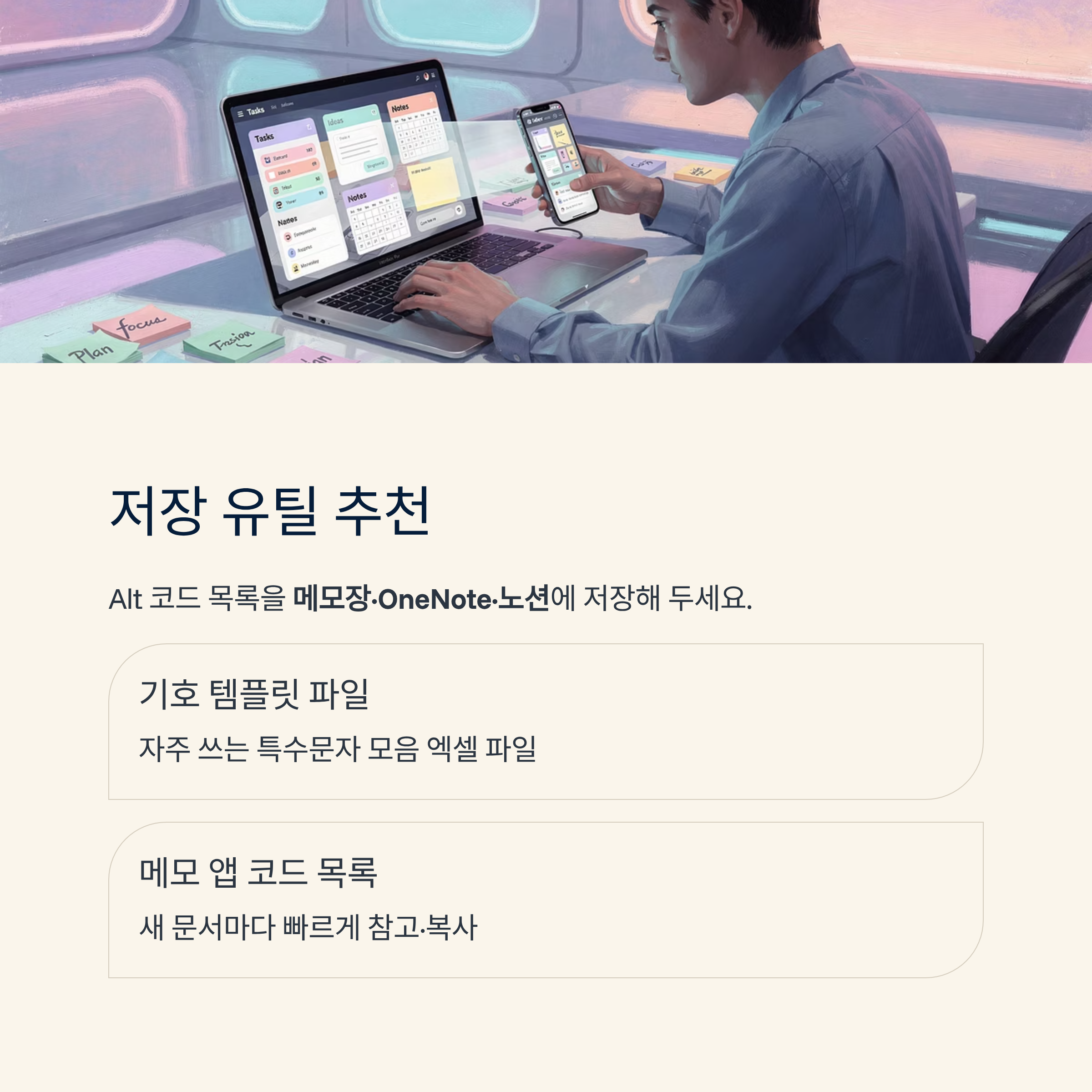자주 쓰는 특수문자를 모아 둔 템플릿 파일, 메모장·OneNote·노션 등 메모 앱에 Alt 코드 목록을 저장해 두면 새 문서를 만들 때마다 빠르게 활용할 수 있어요.