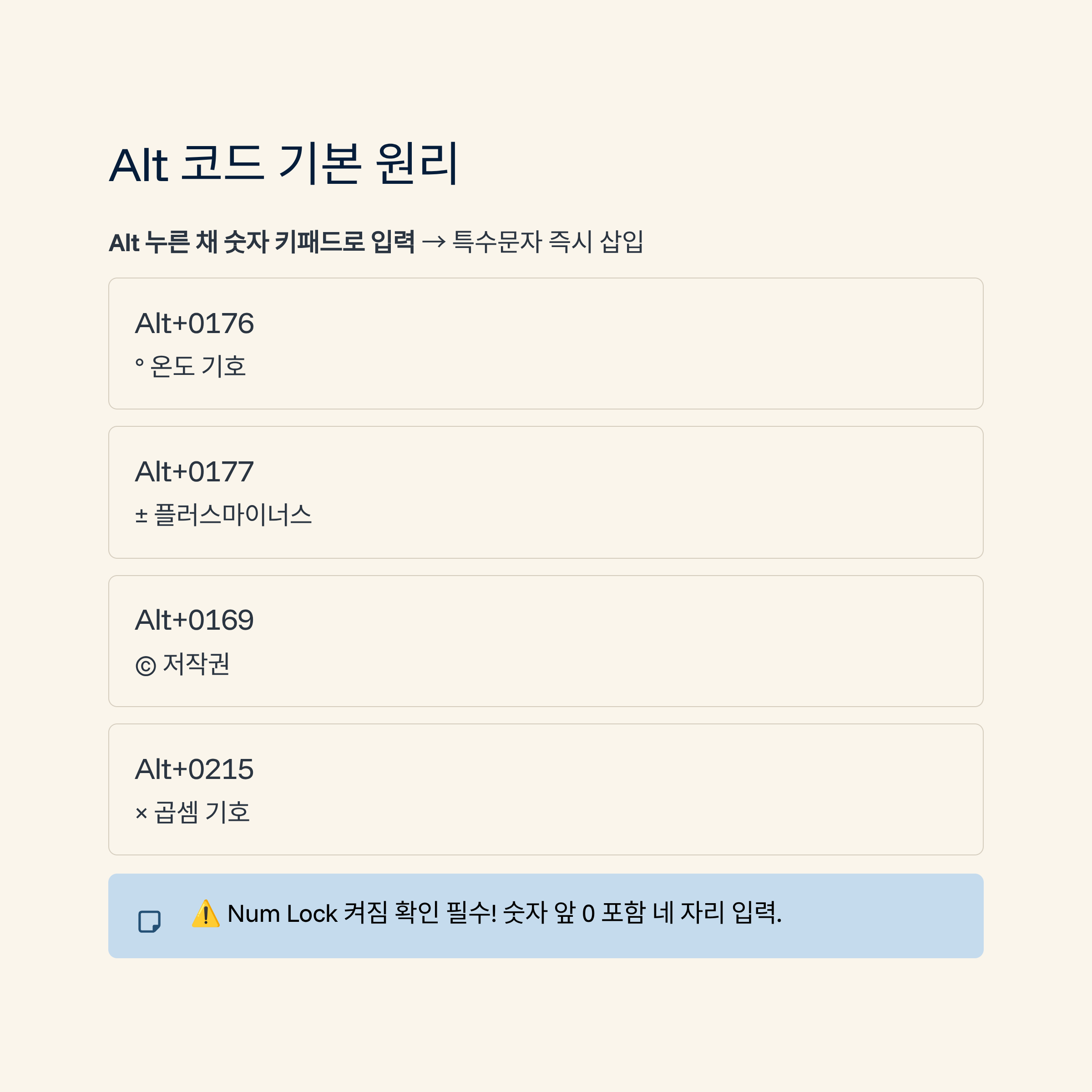 예를 들어 Alt+0176은 °, Alt+0177은 ±, Alt+0169는 ©, Alt+0174는 ®, Alt+0215는 ×처럼 자주 쓰이는 기호들이 숫자 조합으로 연결돼 있어요.