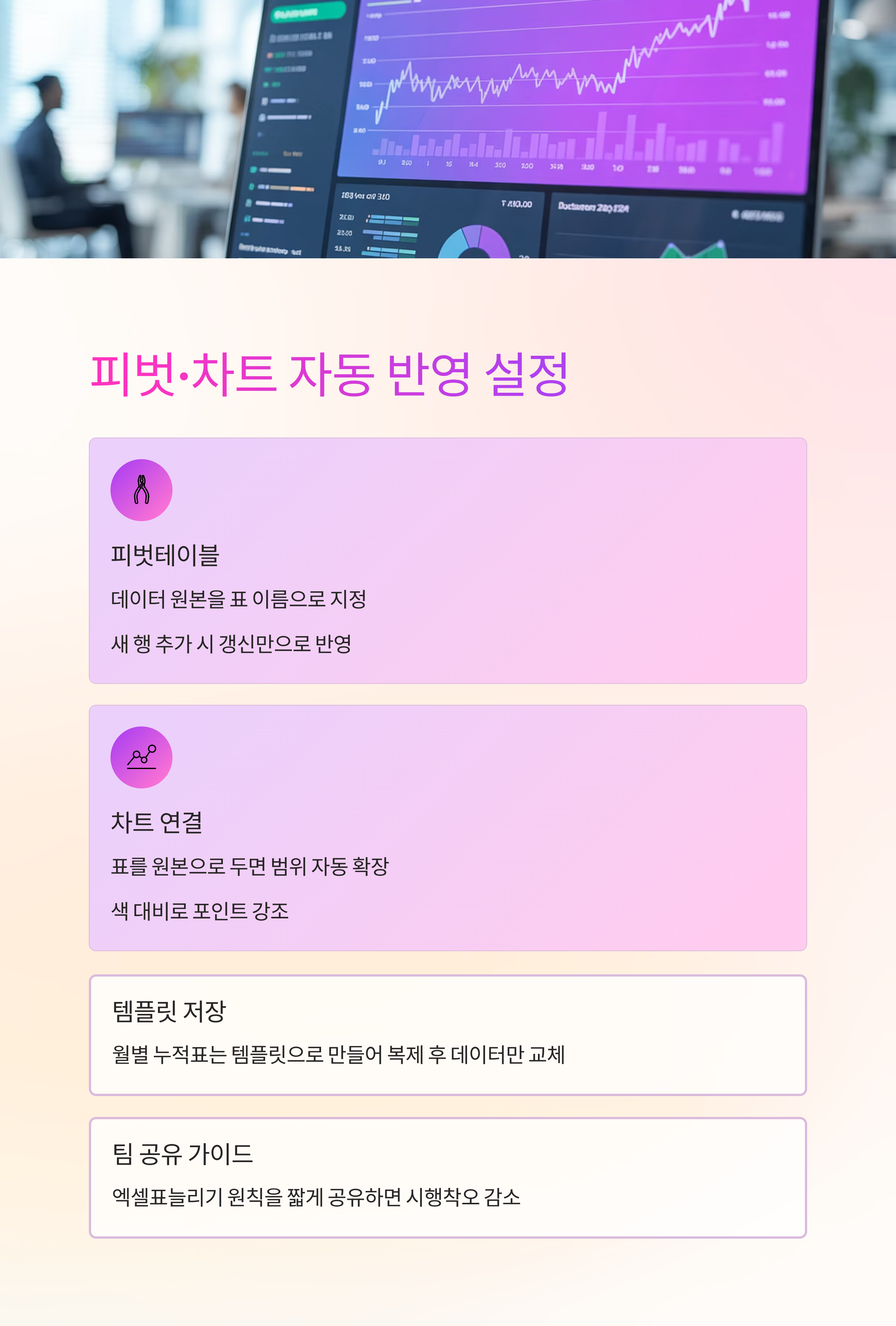 차트도 마찬가지예요. 표를 원본으로 두고 차트를 만들면 범위 확장이 자동으로 연결돼요. 제목과 눈금은 최소만 남기고, 색 대비로 포인트를 주면 읽기 편해요. 조건부 서식 색과 통일하면 일관성이 살아나요.