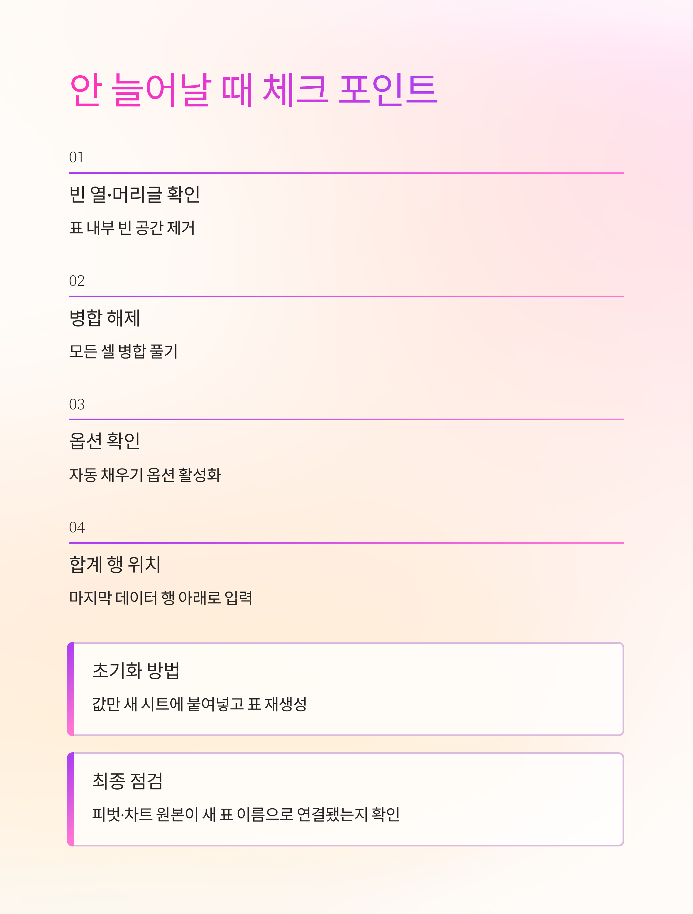 혹시 확장이 멈춘다면 병합이나 빈 머리글이 원인이에요. 병합을 풀고 머리글을 지정하면 바로 회복돼요. 그래도 꼬이면 표를 새로 만들고 원본을 붙여넣어 초기화하세요. 이 과정 자체가 엑셀표늘리기의 안정성을 높이는 손쉬운 복구 절차예요.