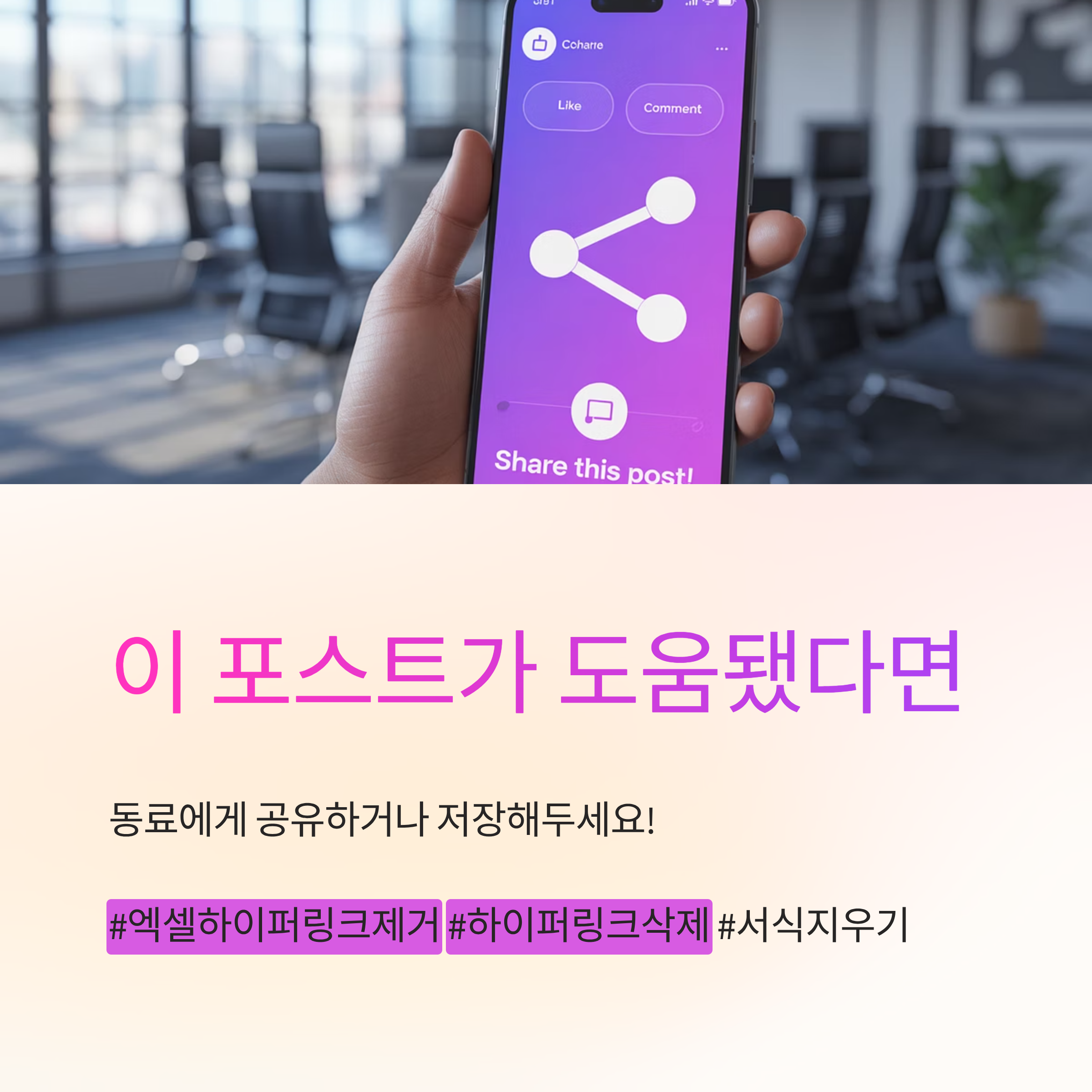 링크가 많아지면 보기만 복잡하지 정보는 늘지 않더라고요. 링크만 부드럽게 걷어내고 필요한 곳에만 남겨두면 표가 훨씬 또렷해져요. 오늘 순서대로 몇 번만 반복해 보세요. 값 붙여넣기와 서식 지우기만 익혀도 정리가 놀랄 만큼 빨라져요. 다음 표를 열 때는 파란 밑줄에 덜 시선이 빼앗길 거예요.