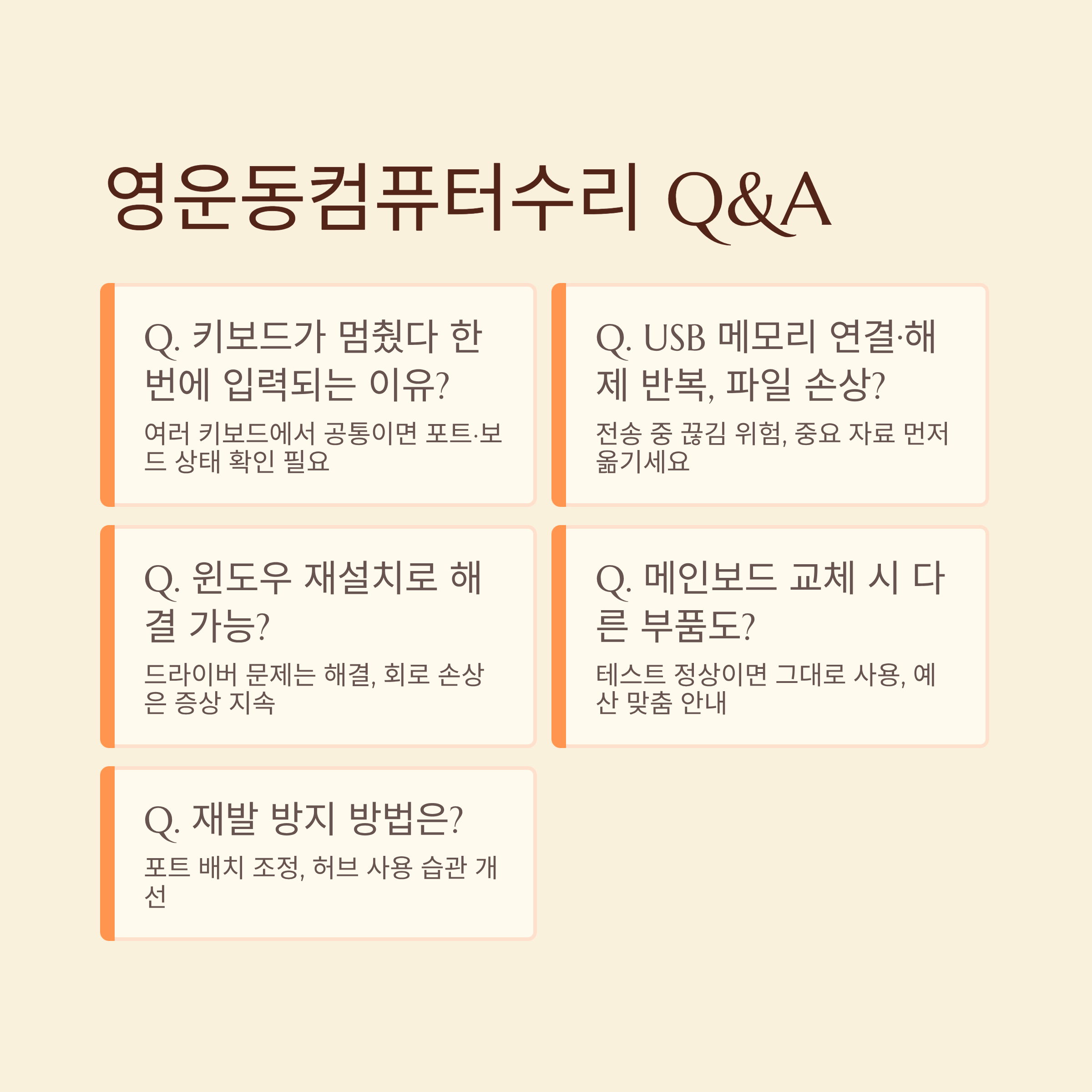 | Q. USB 포트 하나가 고장 나면 다 바꿔야 하나요? | A. 회로 구조에 따라 여러 포트가 한꺼번에 영향을 받을 수 있어서, 증상 범위를 보고 보드 단위로 판단하는 경우도 많아요. |