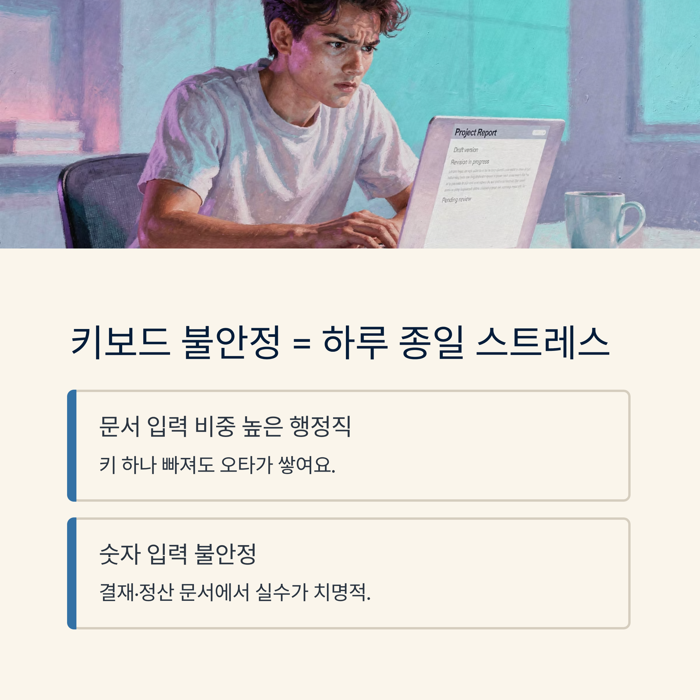 공문을 수정하는데 키가 안 눌리거나 숫자 입력이 들쭉날쭉하면, 오타가 늘어서 업무 속도가 확 떨어지더라구요.