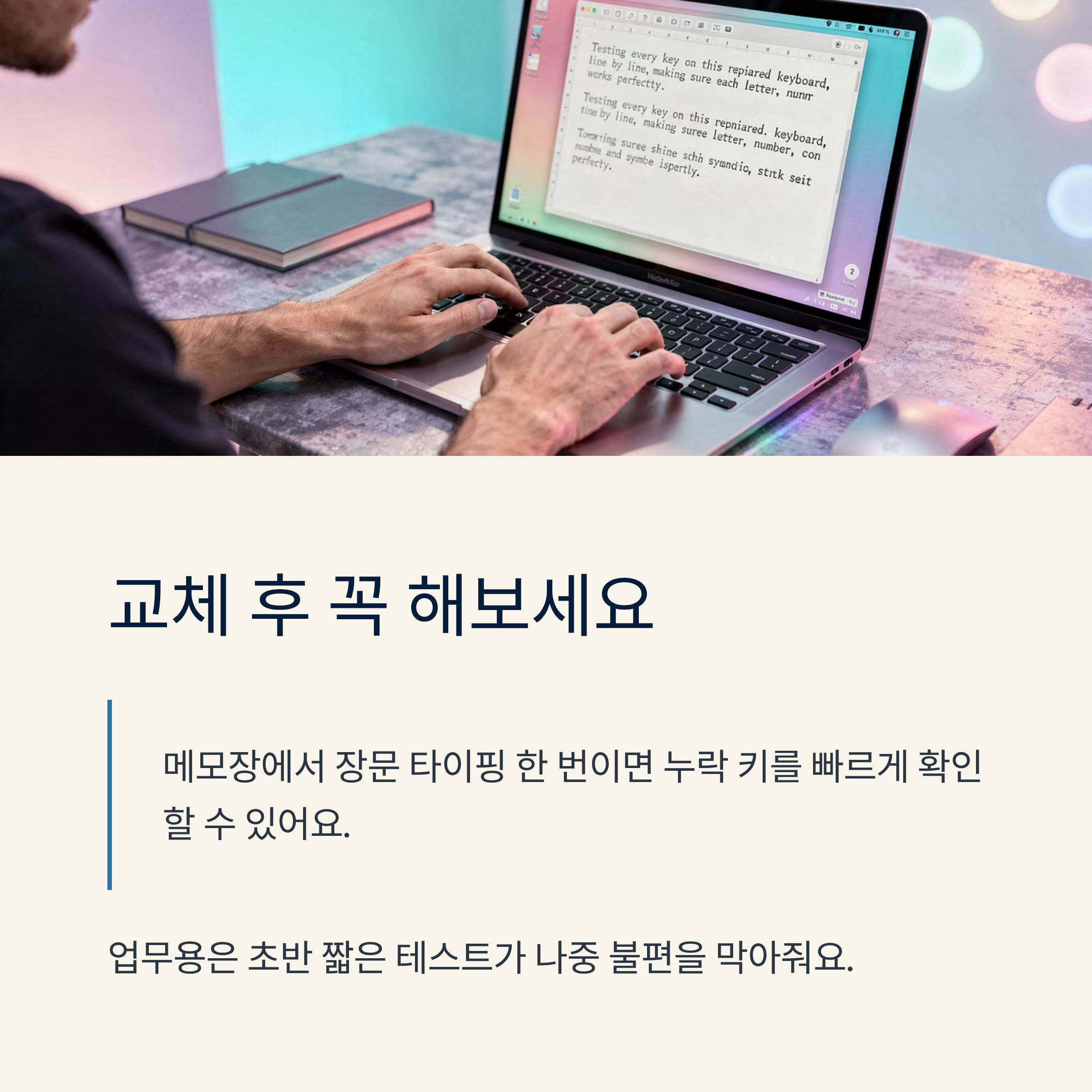 키보드 교체 후에는 한 번 정도 메모장으로 장문 타이핑을 해보면, 누락되는 키가 남아있는지 빠르게 확인할 수 있어요.