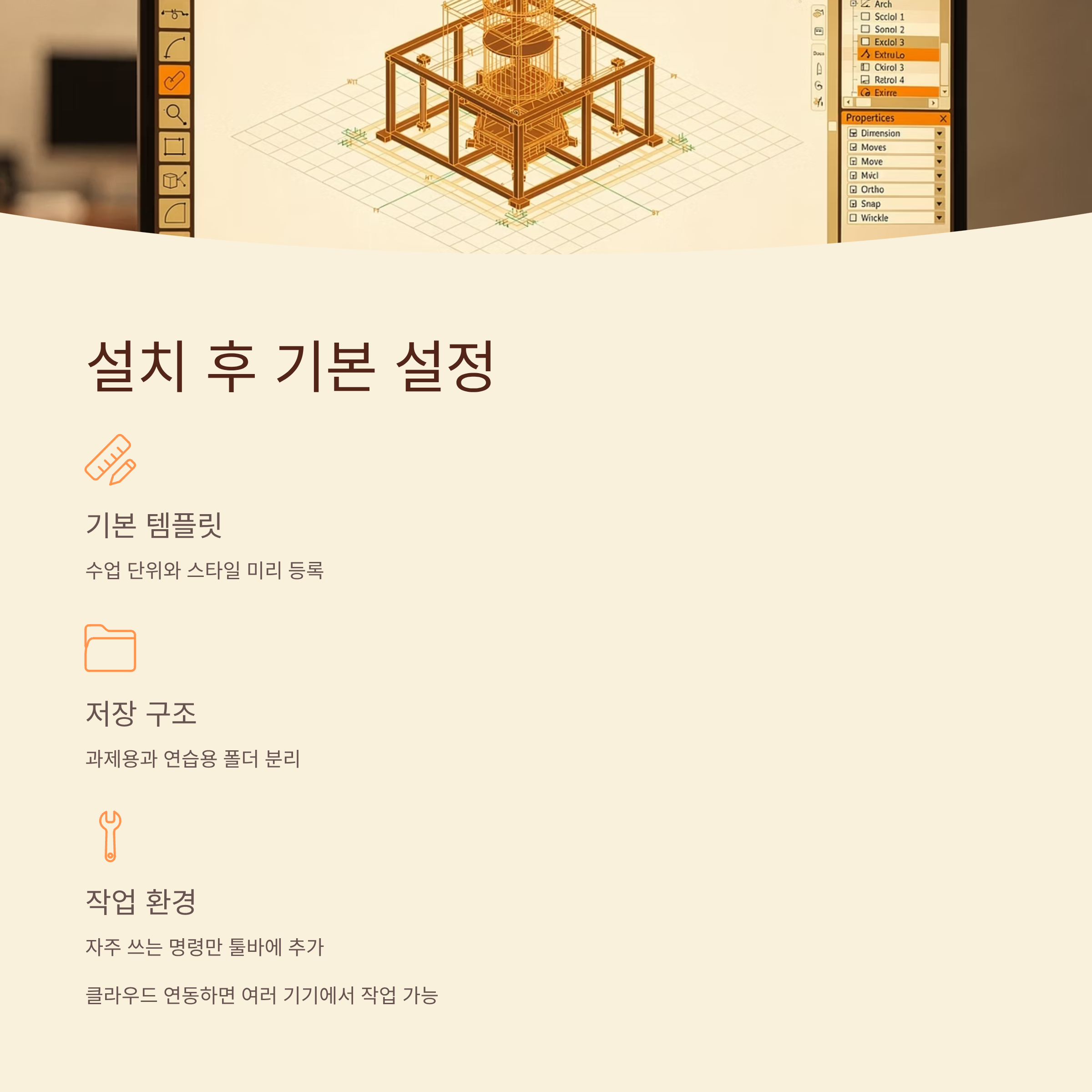 프로그램 설치만 끝내고 기본 설정을 손대지 않으면, 수업 때마다 예제 파일을 여는 데 시간이 더 걸릴 수 있어요. 자주 사용하는 단위와 템플릿을 미리 맞춰두면 과제할 때마다 처음부터 다시 세팅할 필요가 없어서 훨씬 편해요. 학교에서 공유하는 기준 템플릿이 있다면 시작 화면에 바로 뜨도록 등록해두는 것도 좋은 방법이에요.