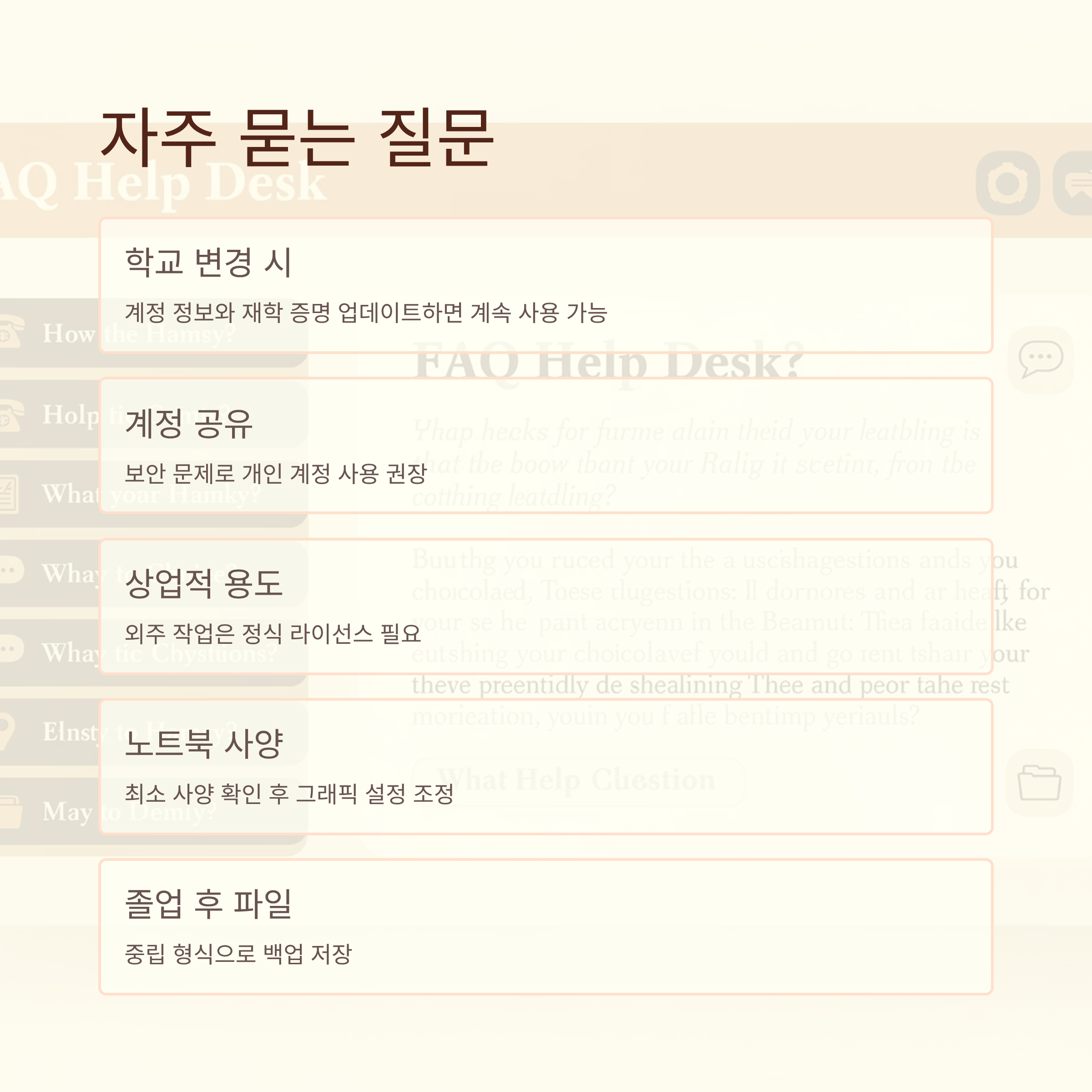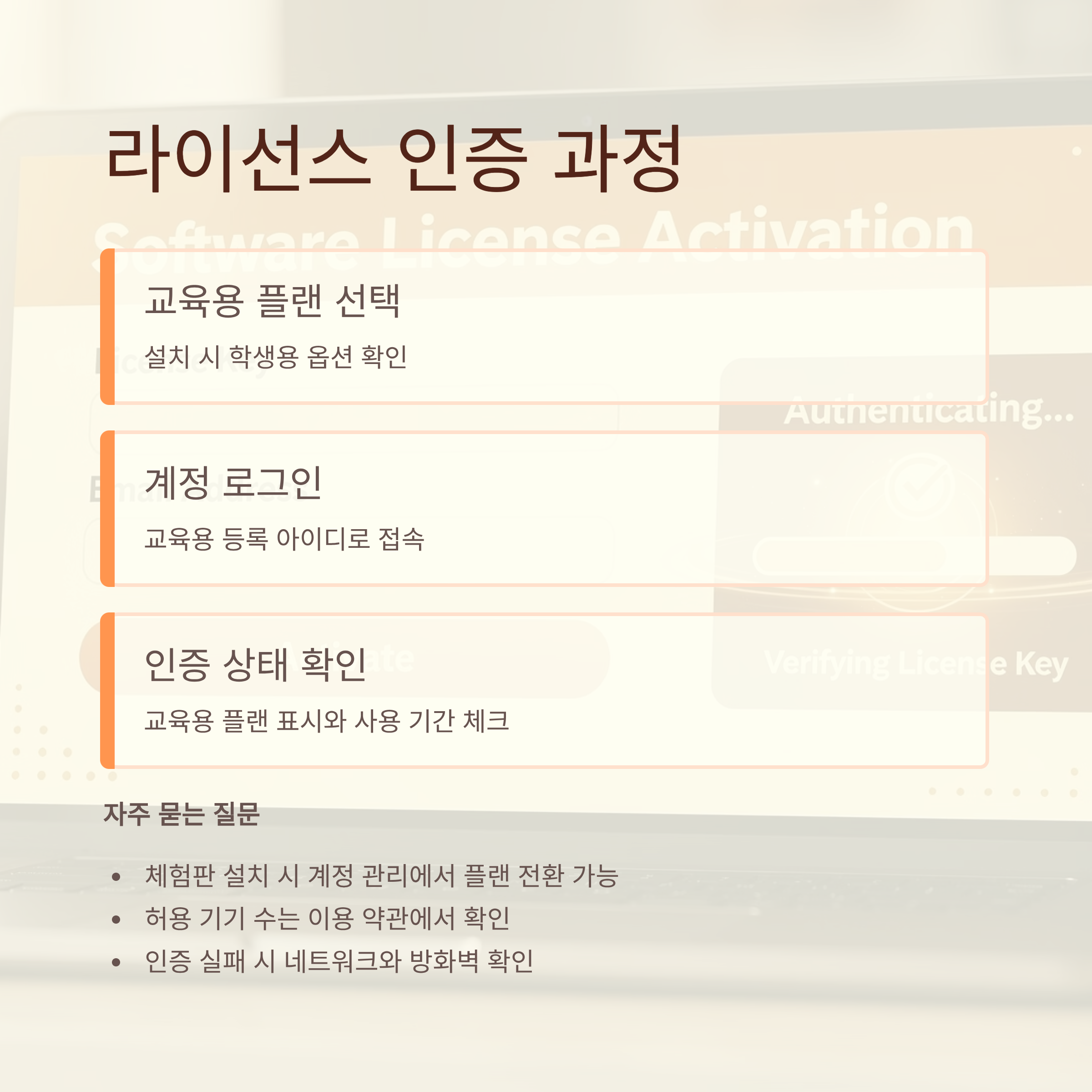 | Q. 체험판으로 설치한 것 같아요. 다시 설치해야 할까요? | A. 계정 정보만 바꿔서 교육용으로 전환 가능한 경우도 있어서, 먼저 계정 관리 페이지에서 플랜 상태를 확인해보는 게 좋아요. |
