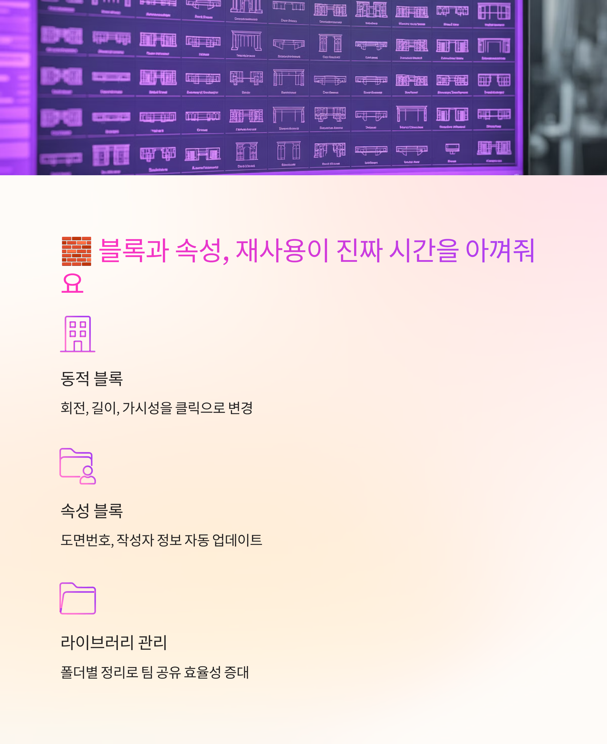 현장 기호나 제목란처럼 반복되는 요소는 블록으로 묶어두는 게 정답이에요. 동적 블록을 쓰면 회전, 길이, 가시성 같은 변수를 클릭 한두 번으로 바꿀 수 있어서 변형된 버전을 따로 만들 필요가 없어요. 라이브러리를 폴더 단위로 나눠서 공용 경로로 지정하면 팀에서도 그대로 쓸 수 있어요.