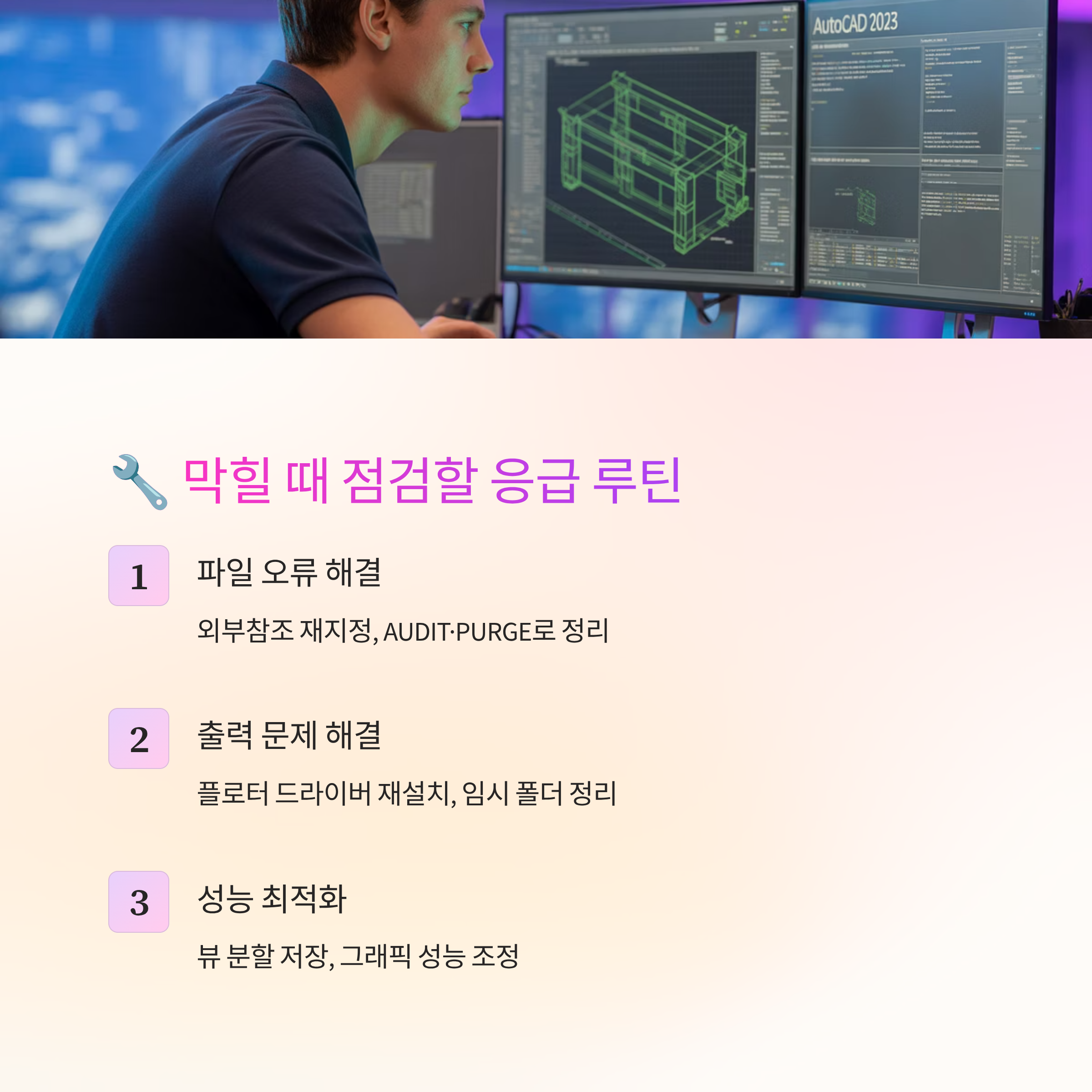출력이 튀거나 멈추면 플로터 드라이버를 한 번 재설치하고, 임시 폴더와 프린트 스풀러를 비워주세요. 테스트 페이지가 정상이면 캐시 문제일 가능성이 커요. 이 루틴만 익혀도 오토캐드지드림 오류 대부분은 부드럽게 수습돼요.