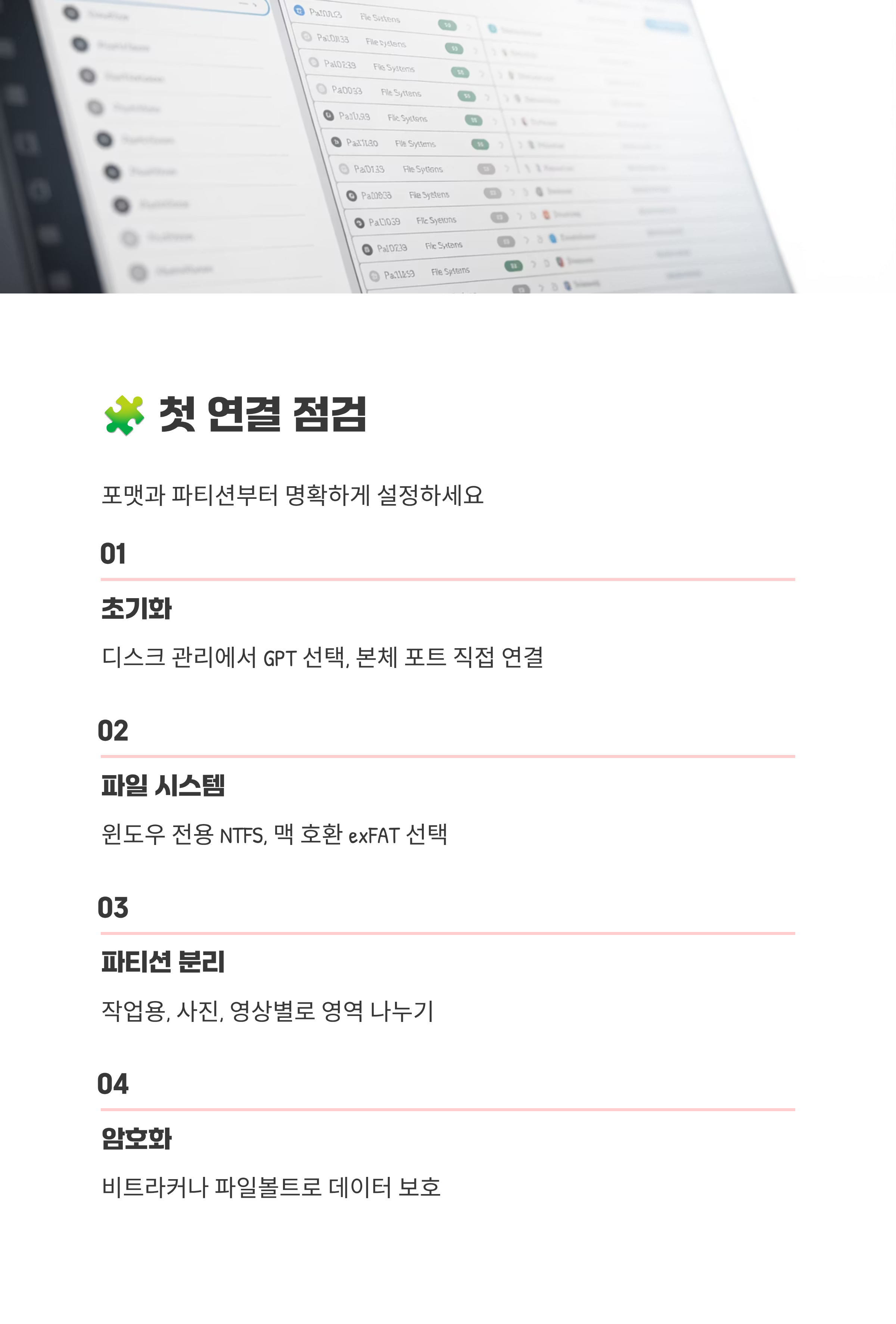 파티션은 목적별로 나누면 관리가 쉬워요. 작업용, 사진 아카이브, 영상 원본처럼 폴더가 아닌 ‘영역’으로 분리하면 실수로 전체를 건드릴 확률이 줄어요. 레이블에 날짜와 목적을 적어두면 연결 장비가 여러 대일 때도 헷갈리지 않아요.