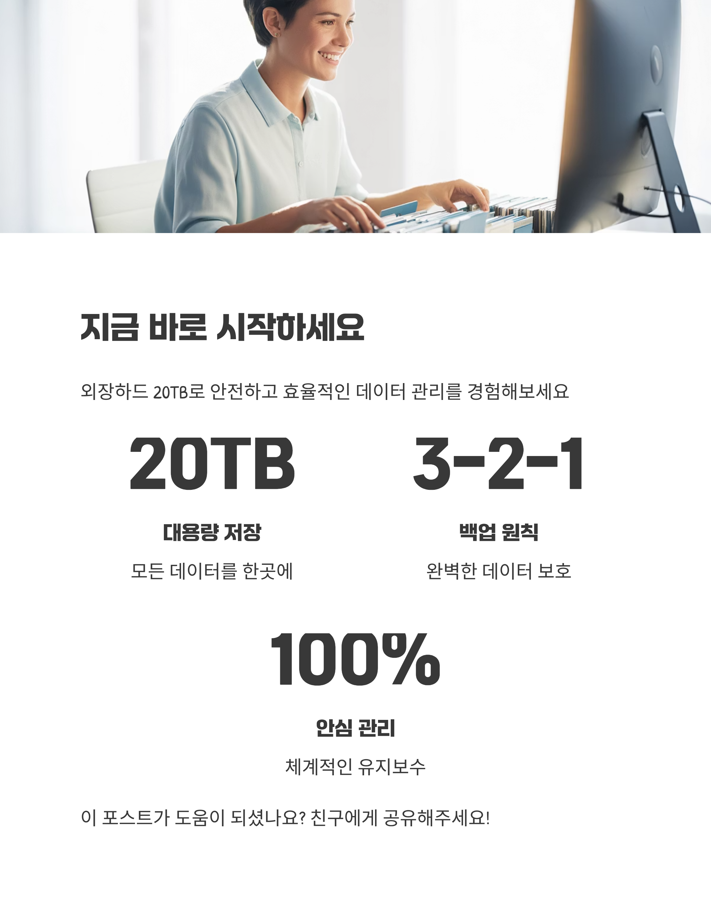 전문 복구가 필요해 보이면 바로 손대지 말고 전원을 끄세요. 자체 분해는 성공 확률을 크게 떨어뜨려요. 의심되면 증상과 사용 환경을 정리해 전달하고, 외장하드20TB 전체 용량과 파일 종류를 알려주면 진단이 빨라져요. 결국 순서가 복구율을 좌우해요.