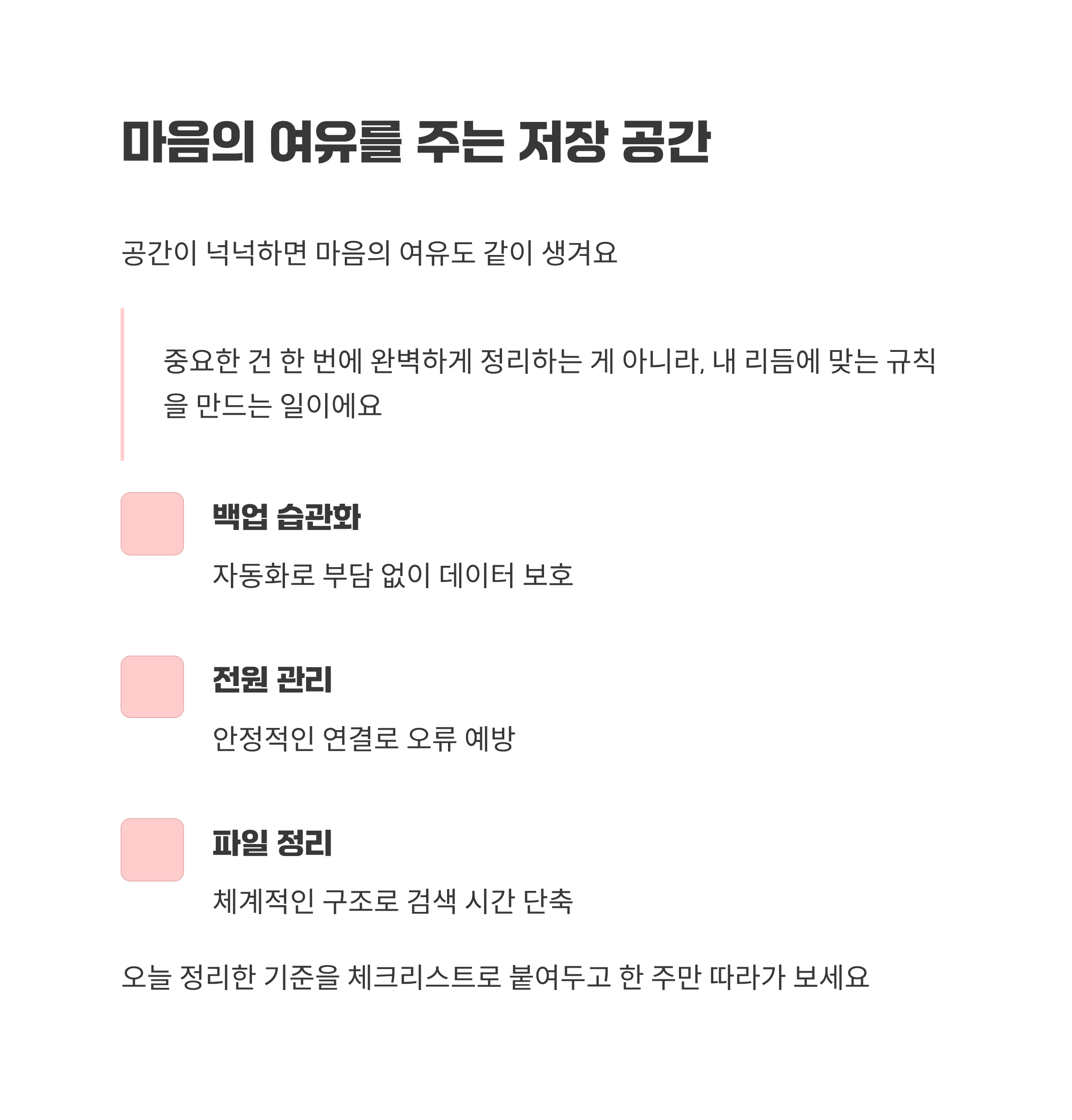 공간이 넉넉하면 마음의 여유도 같이 생겨요. 중요한 건 한 번에 완벽하게 정리하는 게 아니라, 내 리듬에 맞는 규칙을 만드는 일이더라고요. 백업과 전원, 파일 정리만 습관처럼 돌아가면 저장 장치는 조용히 제 역할을 해요. 오늘 정리한 기준을 체크리스트로 붙여두고 한 주만 따라가 보세요. 부담이 줄고, 원하는 파일을 찾는 시간이 눈에 띄게 줄어들 거예요.