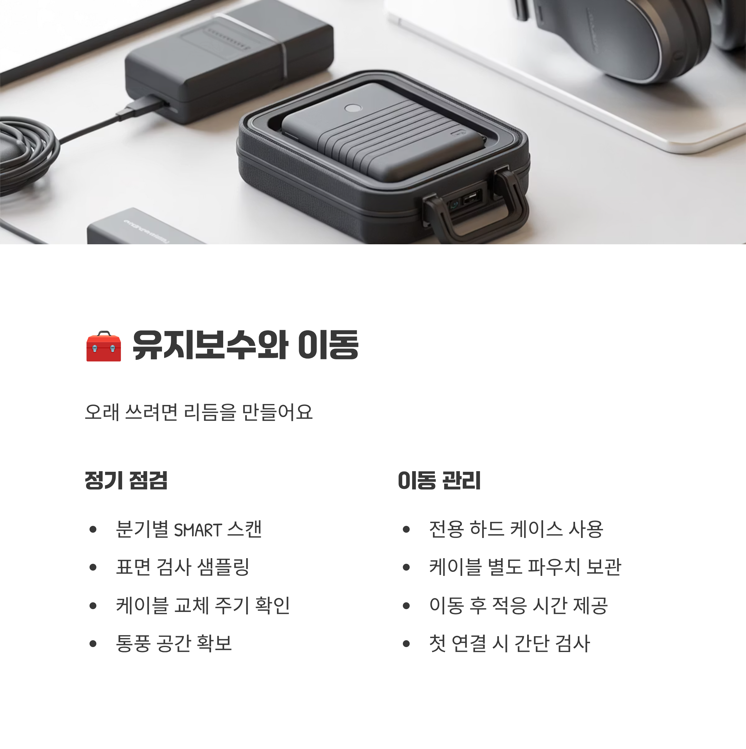휴대가 많다면 짧은 케이블과 완충 파우치를 기본으로 챙겨요. 충격보다 비틀림이 더 위험해요. 가방에서 눌림이 없도록 세로로 세워 넣고, 장시간 이동 후에는 SMART 상태를 한 번 확인해요. 이렇게 하면 외장하드20TB 같은 대용량 드라이브도 오래 안정적으로 쓸 수 있어요.