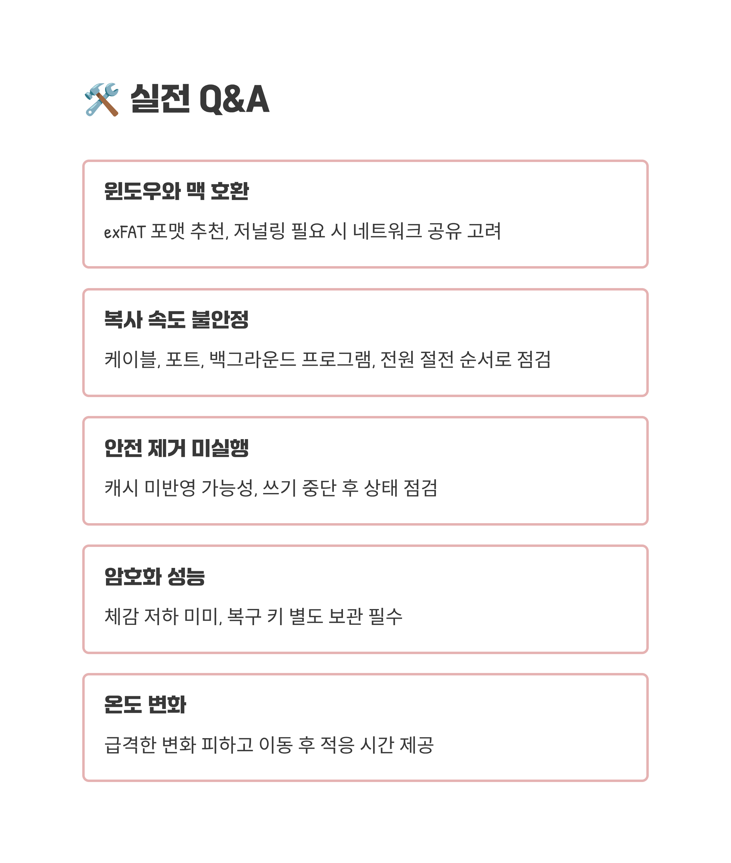 연결 해제는 항상 안전 제거로 마무리해요. 특히 대용량 복사 후 캐시가 덜 내려갔을 수 있어요. LED 액세스 표시가 멈춘 걸 확인하고 분리하면 파일 손상 확률이 줄어요. 전원 버튼이 있는 제품은 먼저 버튼을 끄고 전원을 분리하는 순서가 안전해요.