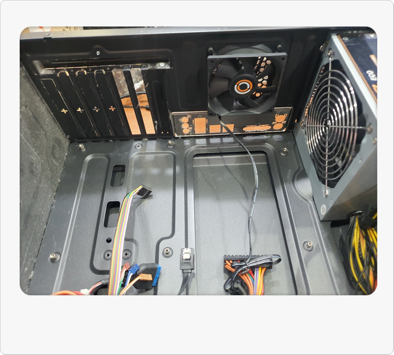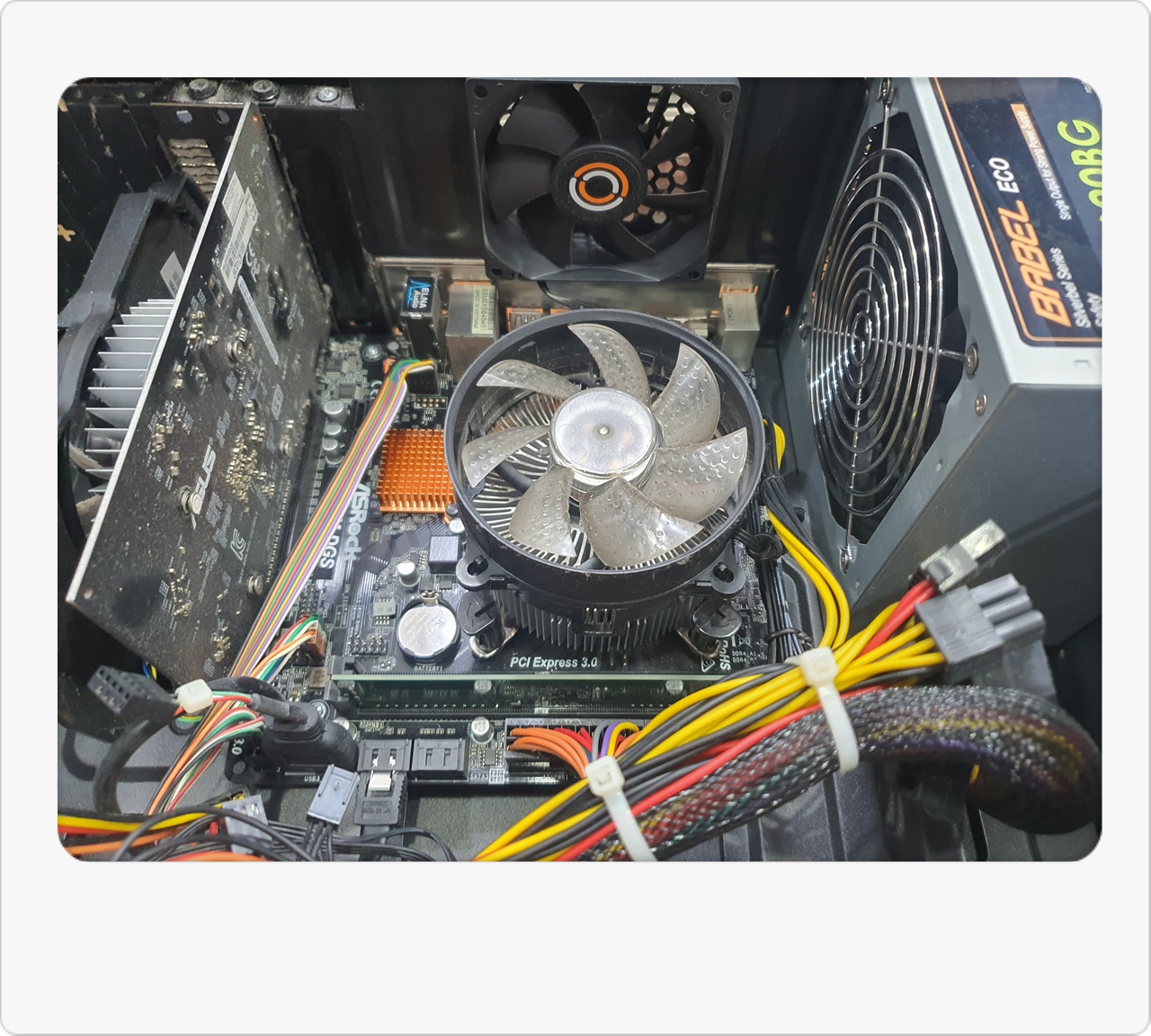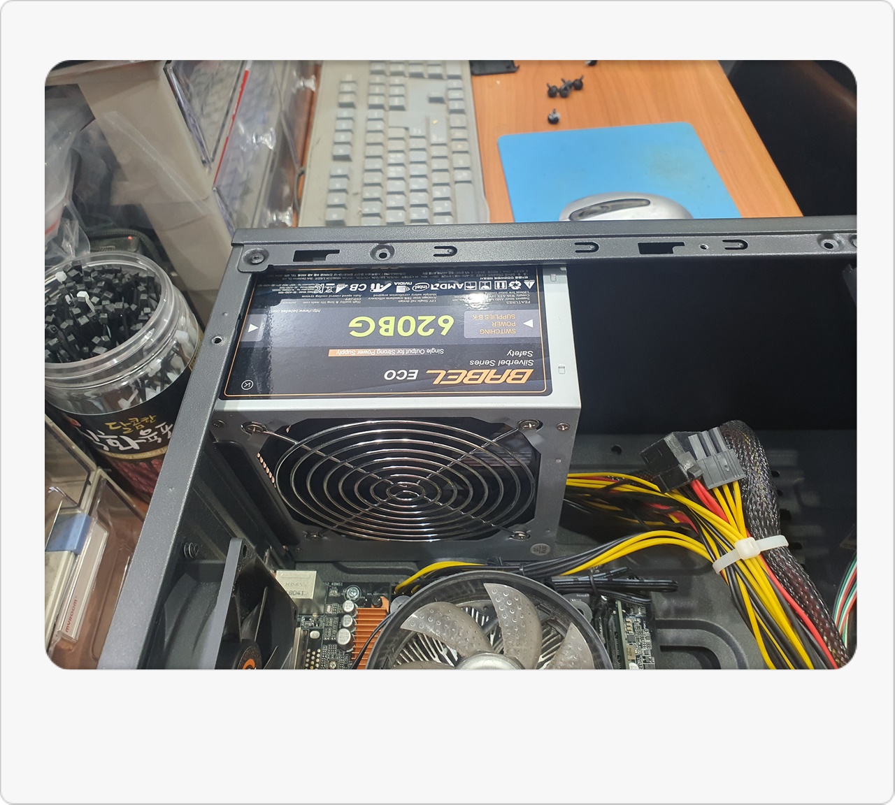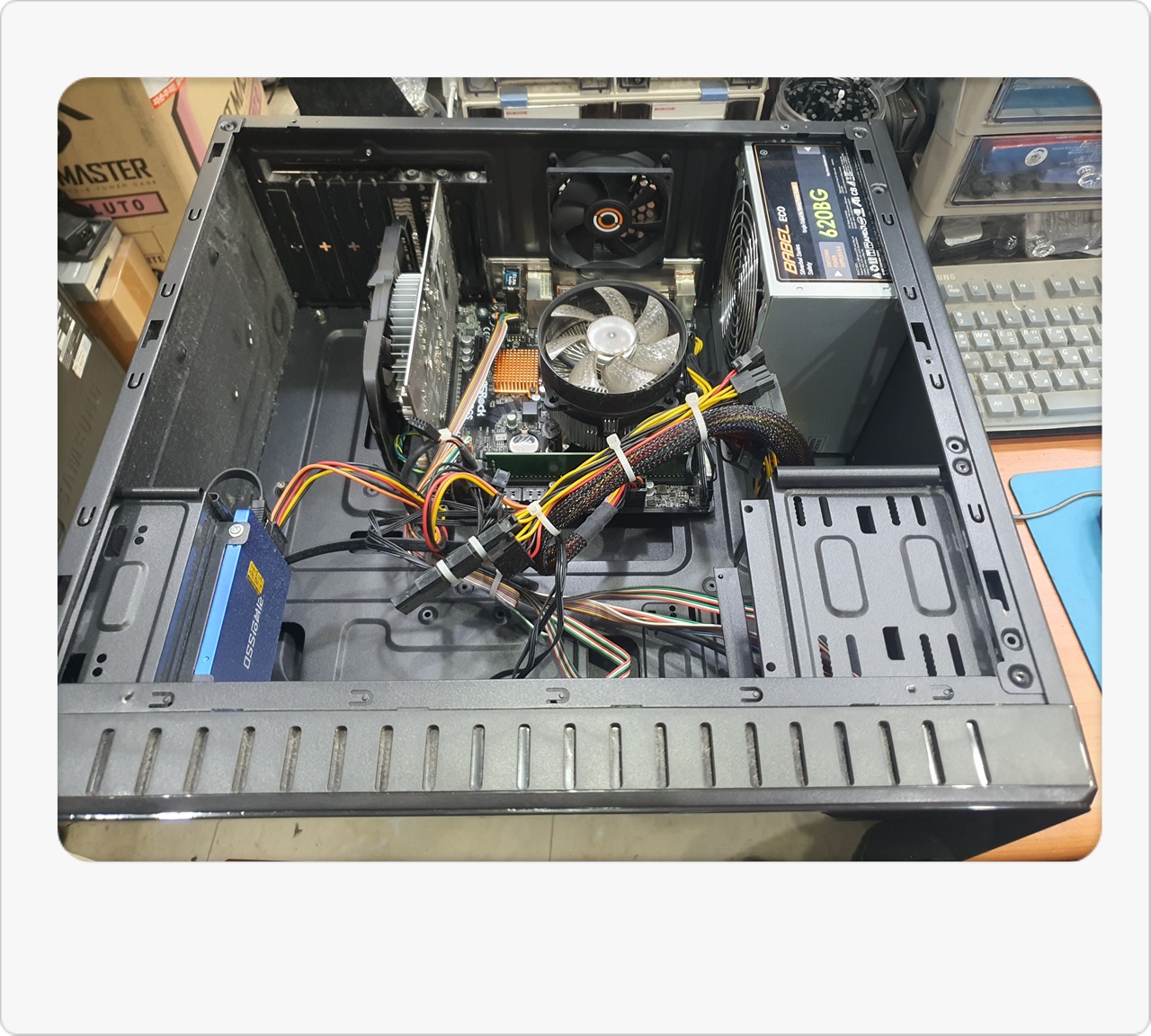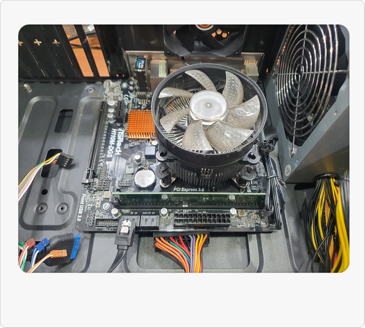 그래서 조금 더 체계적으로 점검을 진행해봤어요. 내부 부품들을 순차적으로 분리하고 테스트 메모리, 테스트 파워서플라이 등을 활용해보니, 결국 메인보드 자체가 고장 난 것으로 판명됐습니다. 손님께서는 “이 본체로 어느 정도 게임도 즐기는데, 갑자기 화면이 꺼지면 난감하다”라고 말씀하시더라고요. 저 역시 예전에 비슷한 문제를 겪어서 답답한 마음을 잘 알고 있답니다. 그래서 신속하게 대응하기 위해 재고로 보유 중이던 H110M 메인보드를 바로 장착하기로 결정했습니다.