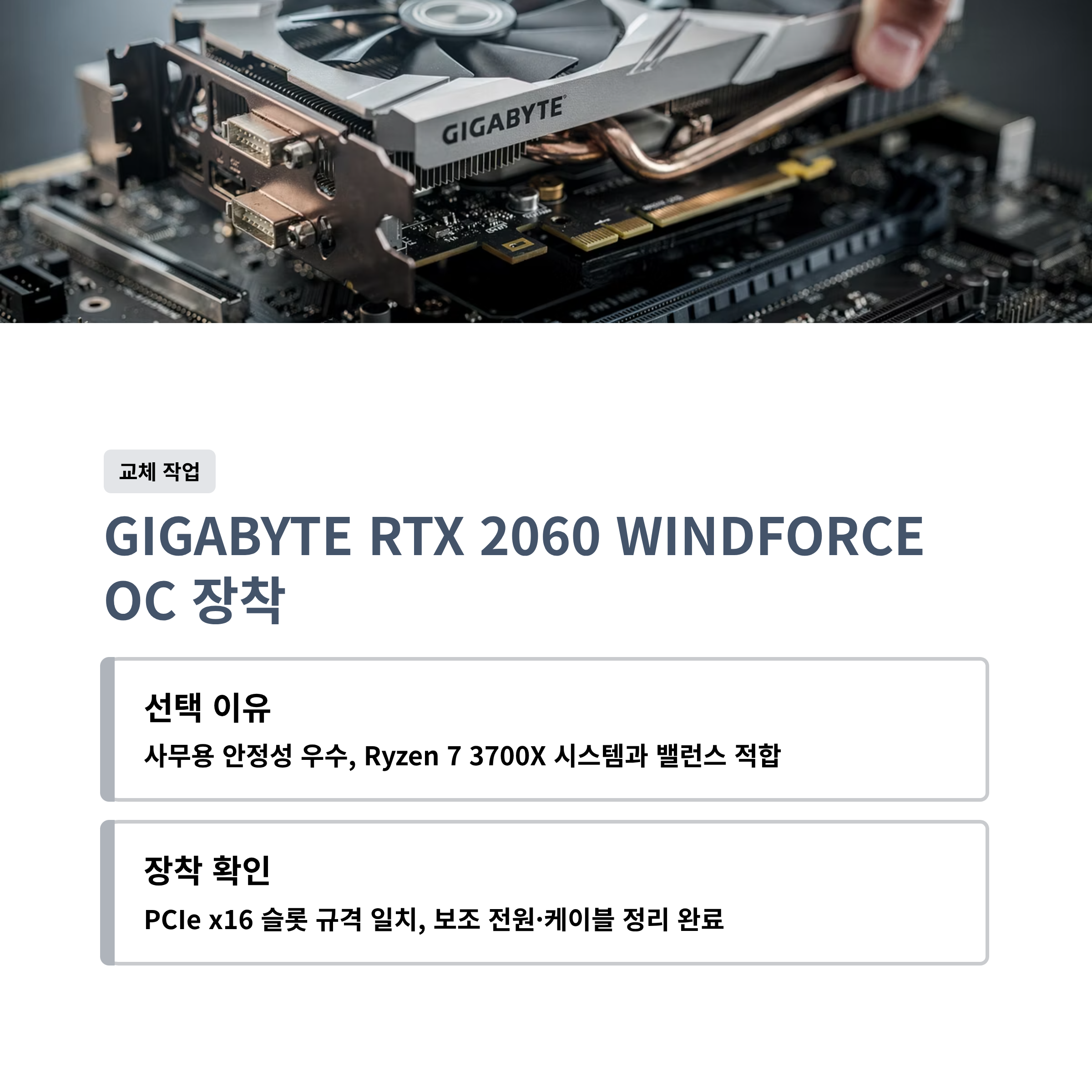 | 조치 내용 | PCIe x16 슬롯에 GIGABYTE RTX 2060 WINDFORCE OC 장착, 부팅 및 영상 안정성 테스트 |