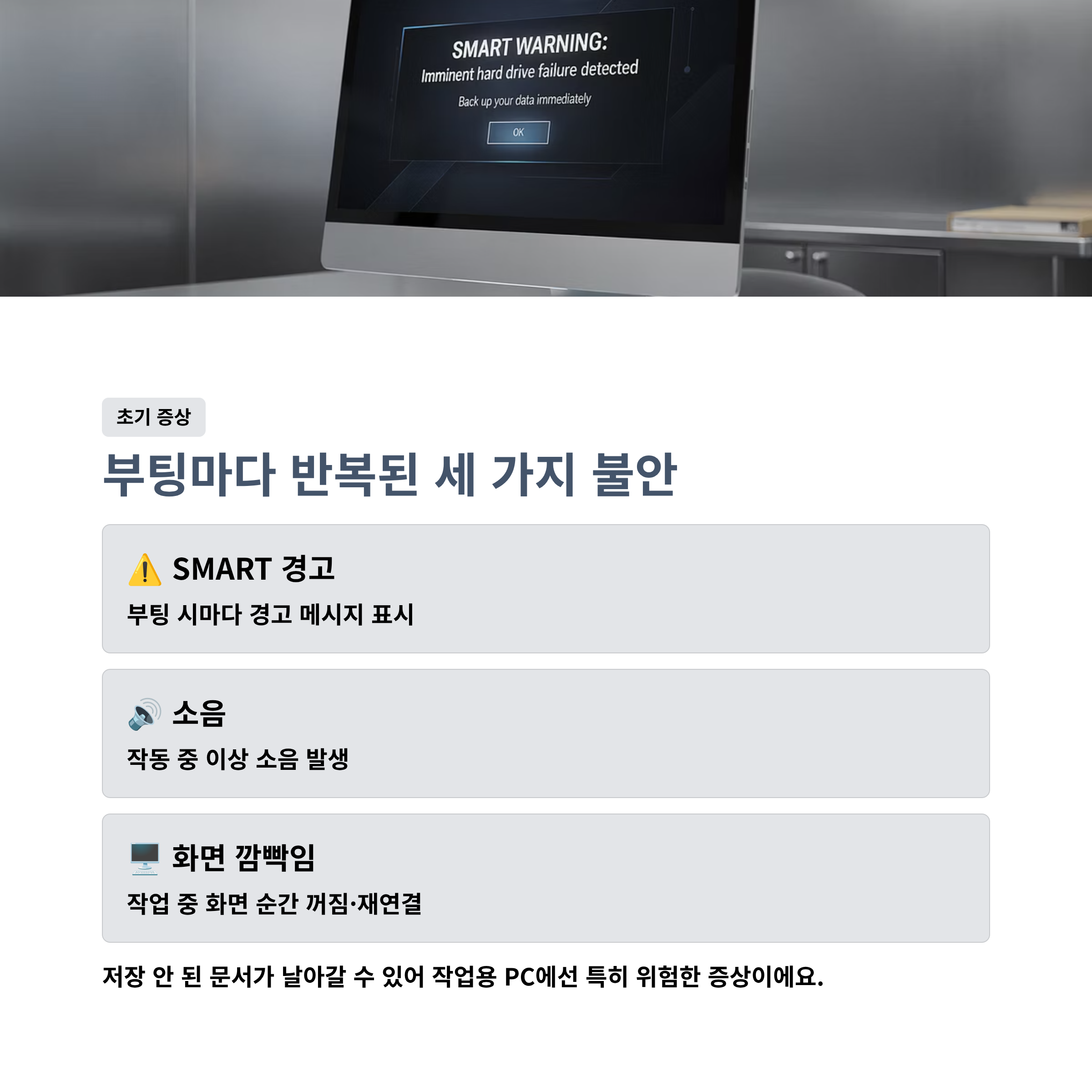고객님 PC는 부팅을 하면 SMART 경고 메시지가 먼저 뜨고, 동시에 소음과 화면 깜빡임까지 겹쳐서 불안하다고 하셨어요.