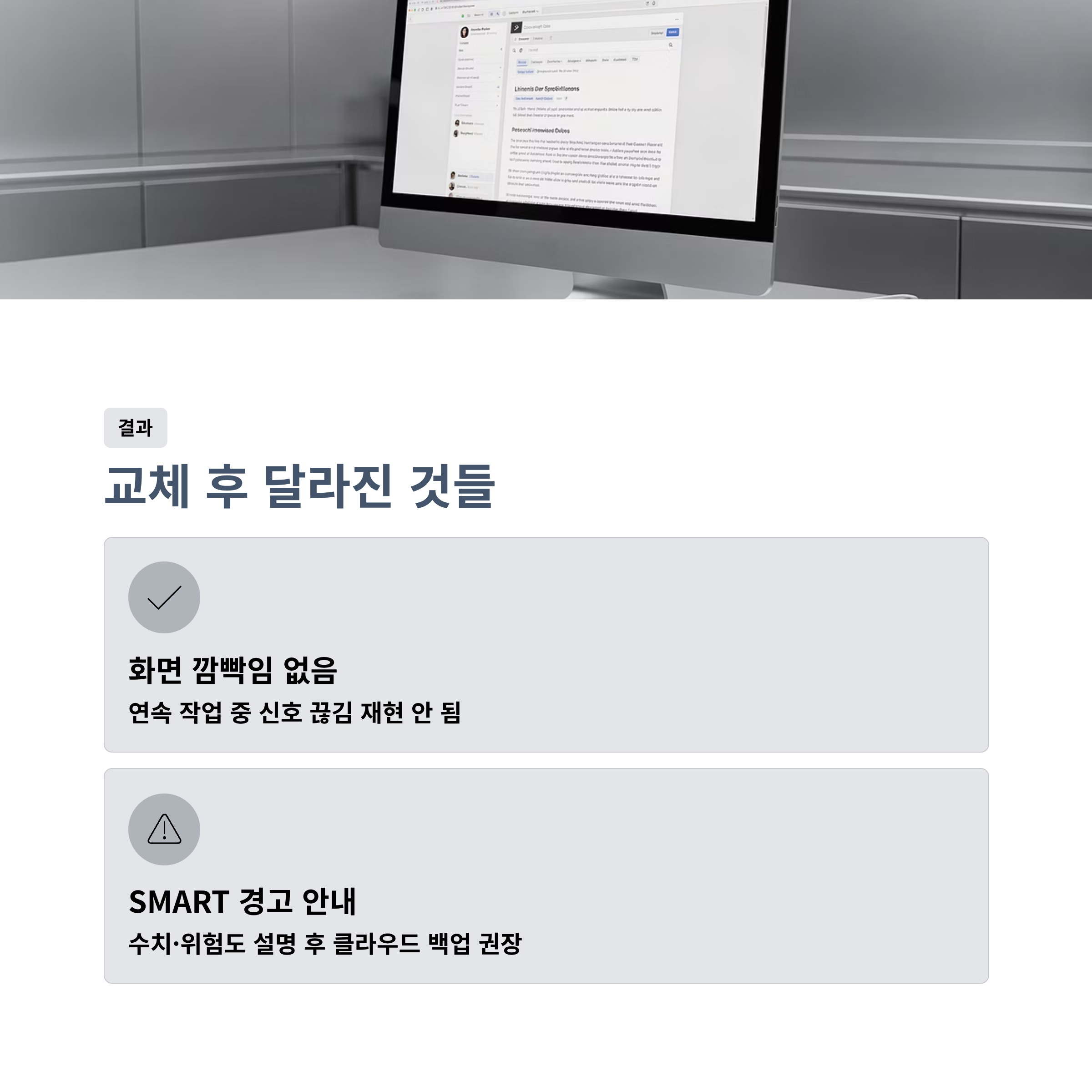| 주요 증상 | 부팅 시 SMART 경고 표시, 작업 중 화면 깜빡임 |