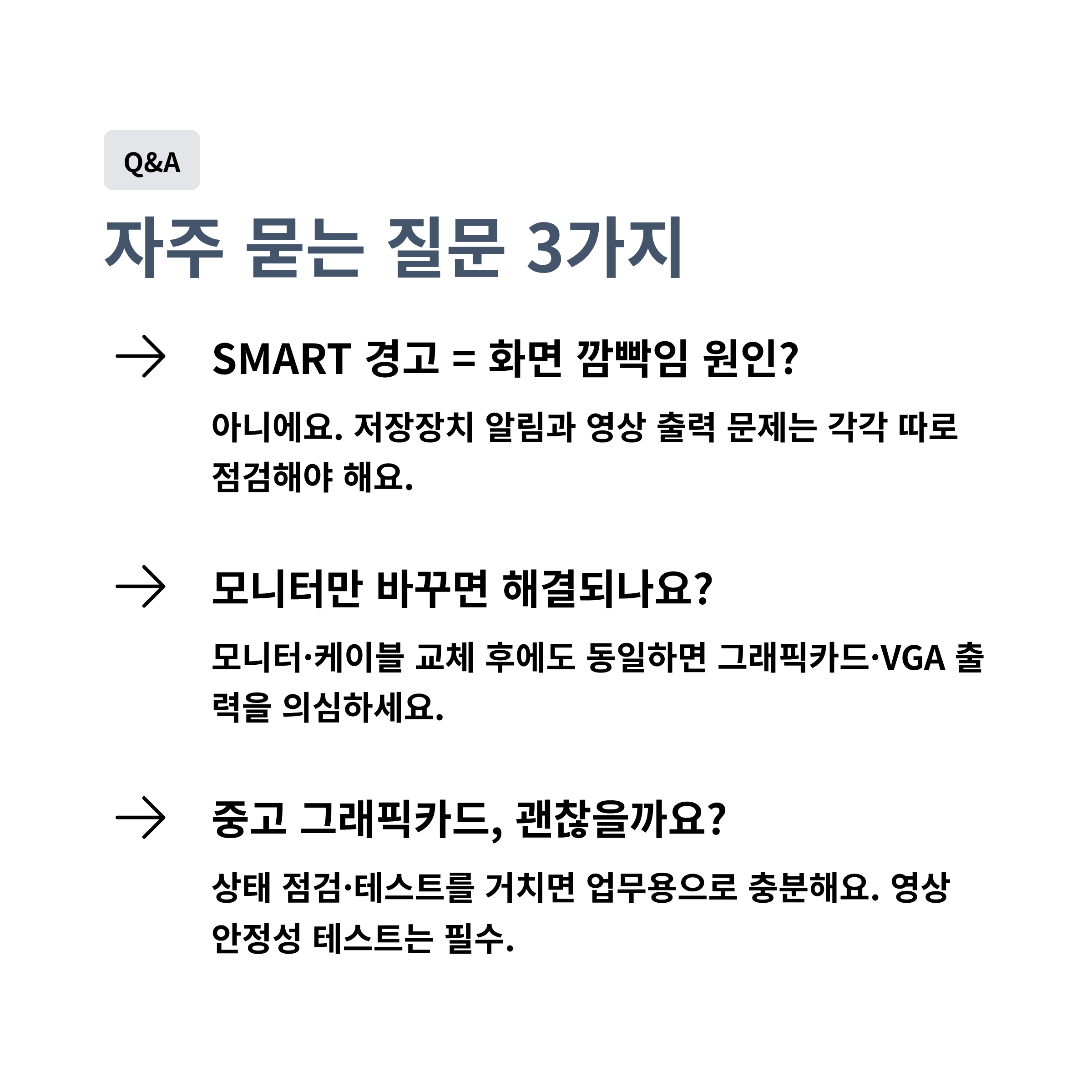 | SMART 경고가 뜨는데 화면도 깜빡이면 둘 다 같은 문제인가요? | 경고는 저장장치 상태 알림이고, 화면 깜빡임은 그래픽·출력 계열 문제일 수 있어 각각 나눠서 점검하는 게 좋아요. |