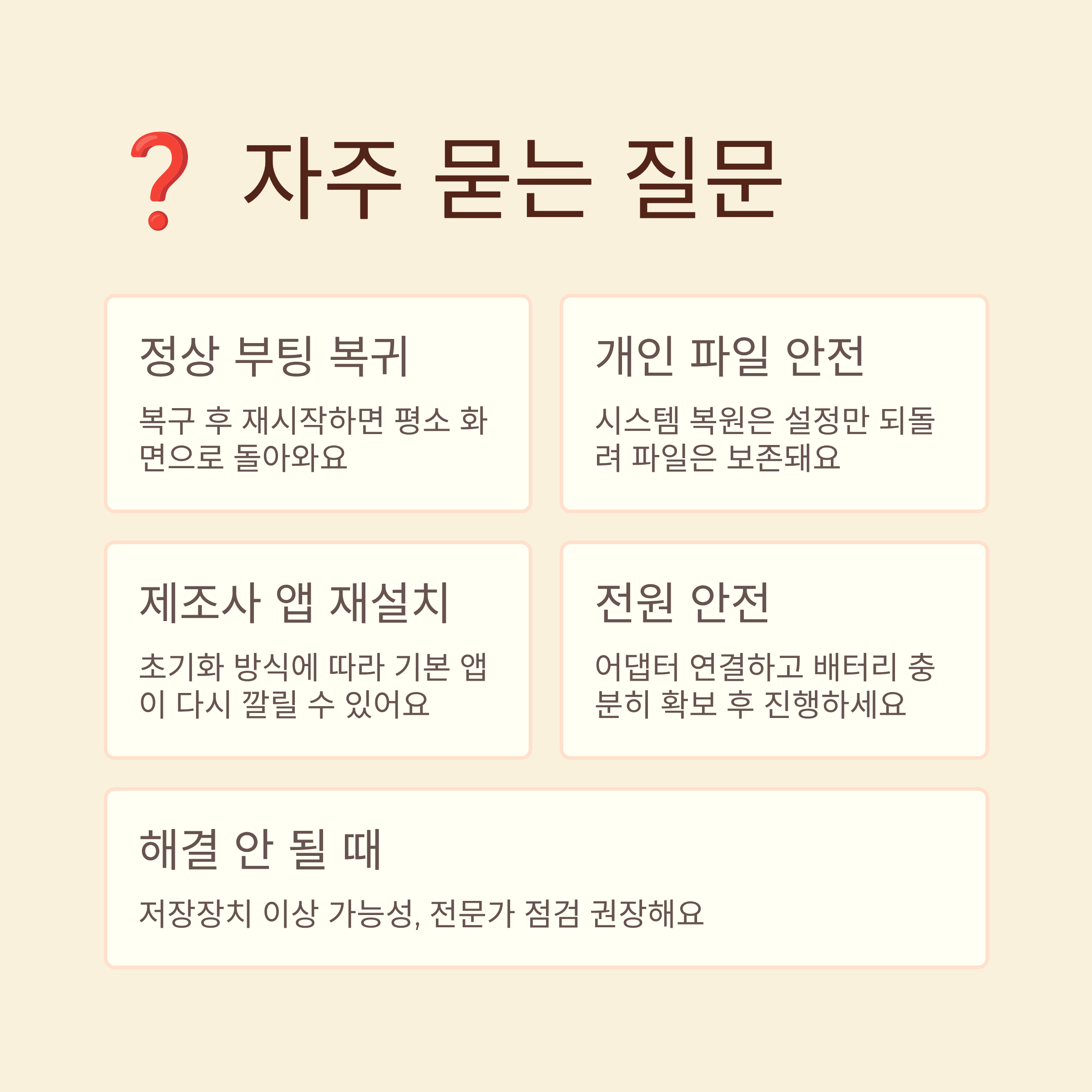 A1. 복구 도구 사용을 마치고 재시작을 선택하면 보통 평소 화면으로 돌아오고, 추가 설정이 필요할 때는 안내 메시지가 한 번 더 떠요.