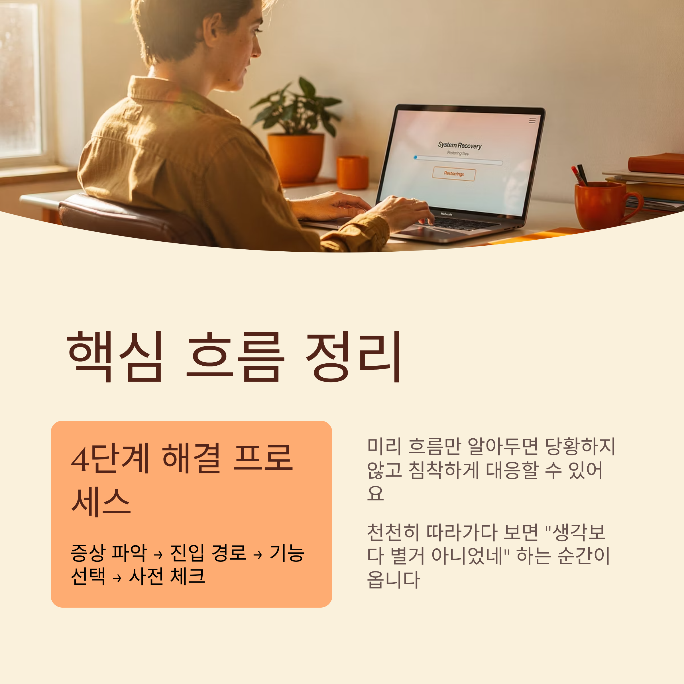 시스템 문제가 생기면 누구라도 당황할 수밖에 없지만, 미리 흐름만 알고 있으면 생각보다 침착하게 대응할 수 있어요. 오늘 정리한 증상 파악 → 진입 경로 확인 → 기능 단계별 사용 → 복구 전 체크리스트 순서만 머릿속에 넣어 두셔도 큰 도움이 되거든요. 언젠가 비슷한 상황이 찾아왔을 때, 이 내용을 한 번 떠올리고 천천히 따라가 보시면 "생각보다 별거 아니었네" 하는 느낌을 분명 한 번쯤은 경험하게 되실 거예요.