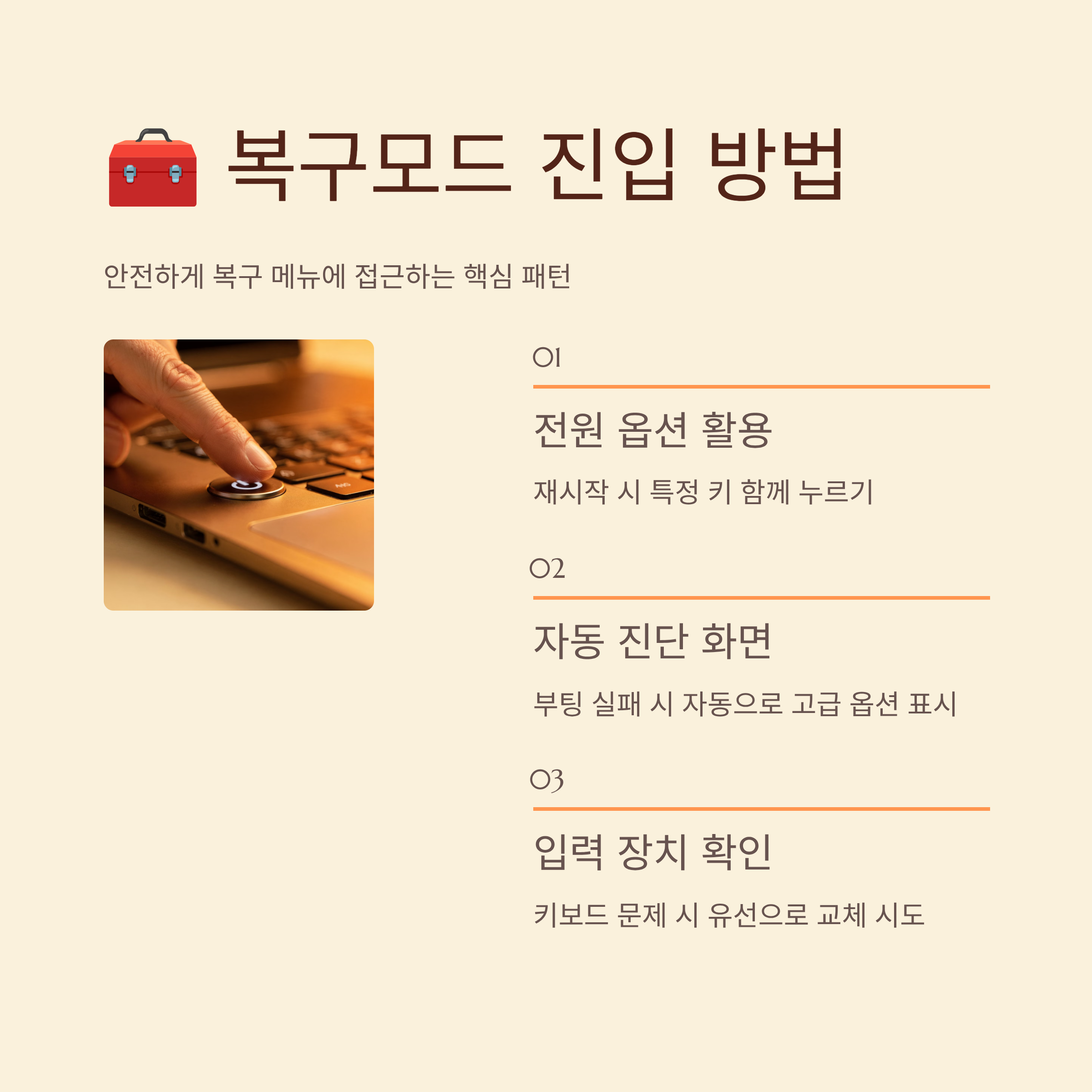 복구 도구를 쓰려면 우선 해당 메뉴까지 들어가야 하는데, 평소에 한 번도 안 해봤다면 여기서부터 막히기 쉽죠. 하지만 전원 버튼과 부팅 과정을 이용하는 몇 가지 패턴만 알아두면, 생각보다 간단하게 메뉴까지 도달할 수 있어요.