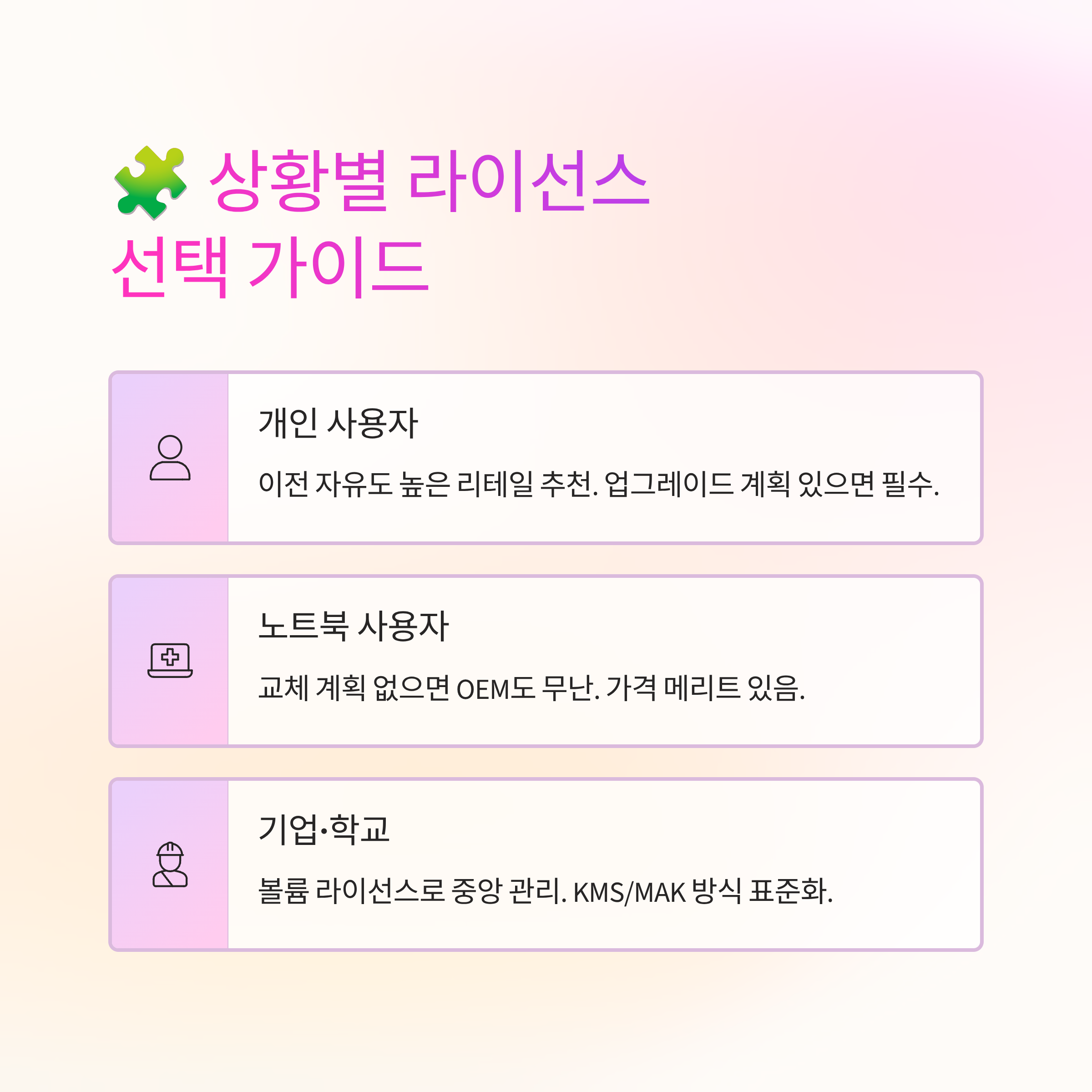 회사·학교처럼 다수 장치를 관리한다면 볼륨 라이선스가 더 맞아요. 중앙에서 키를 묶어 관리하고, KMS/MAK 같은 방식으로 배포를 표준화할 수 있어요. 혼용하면 감사·재설치 때 꽤 번거로워요.