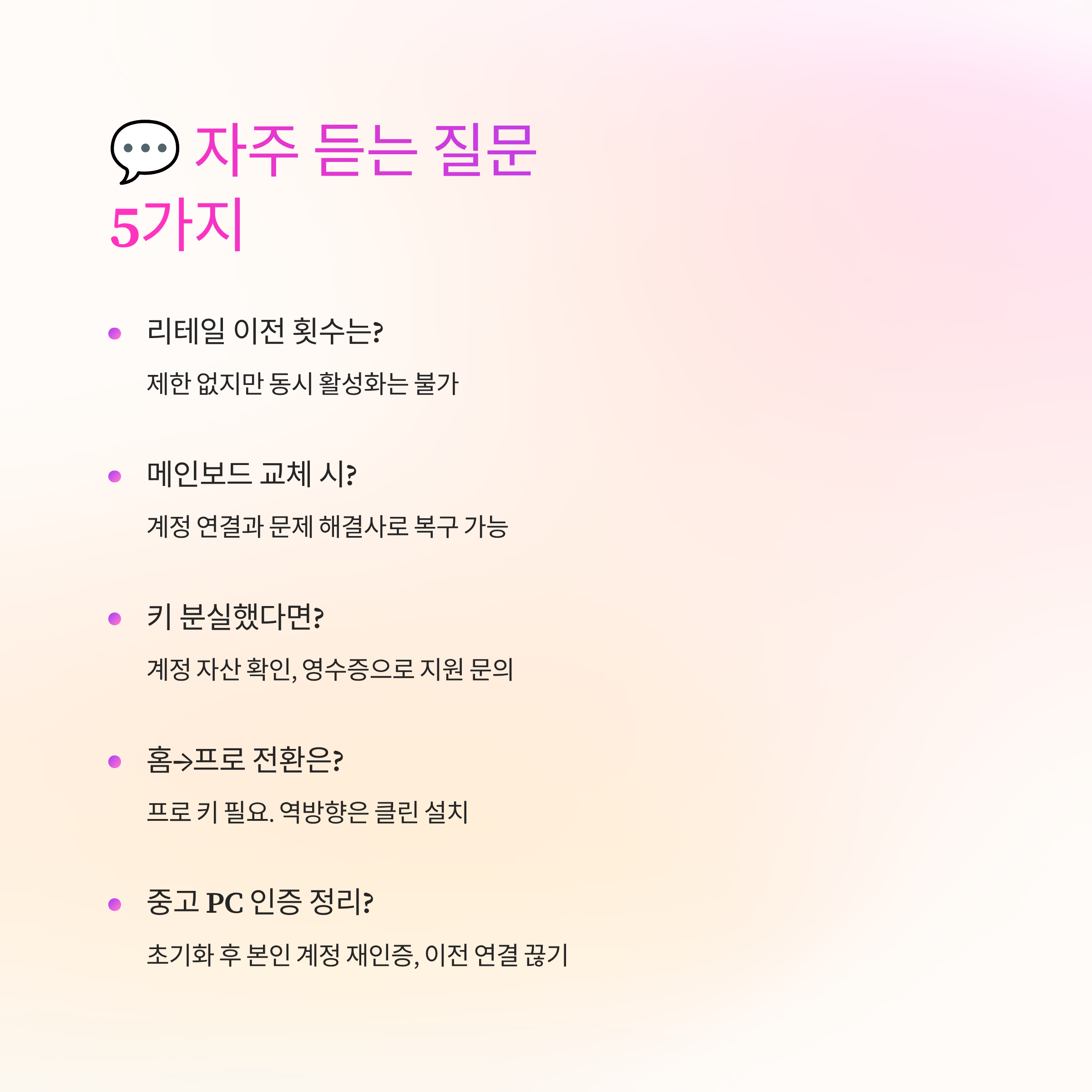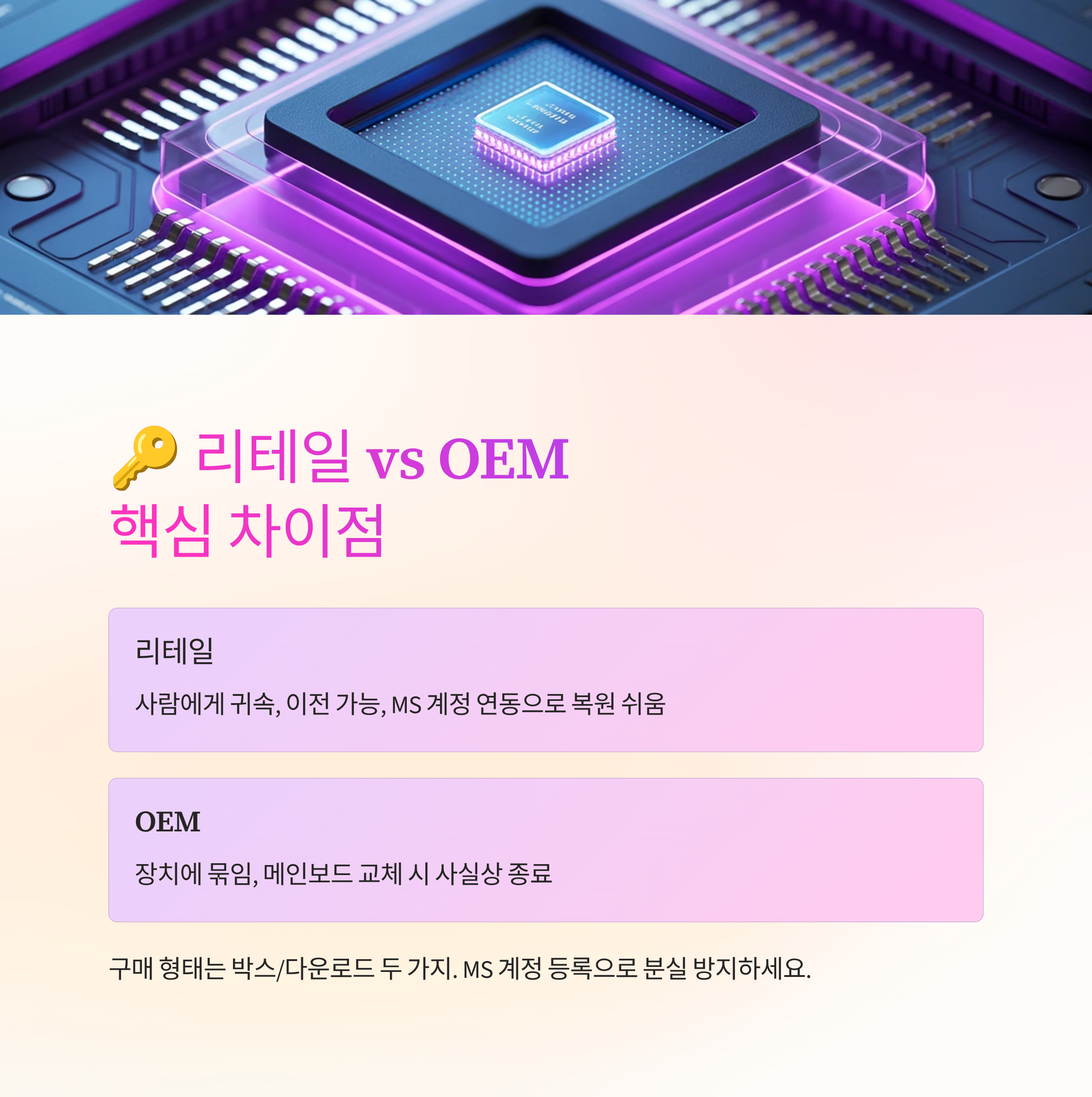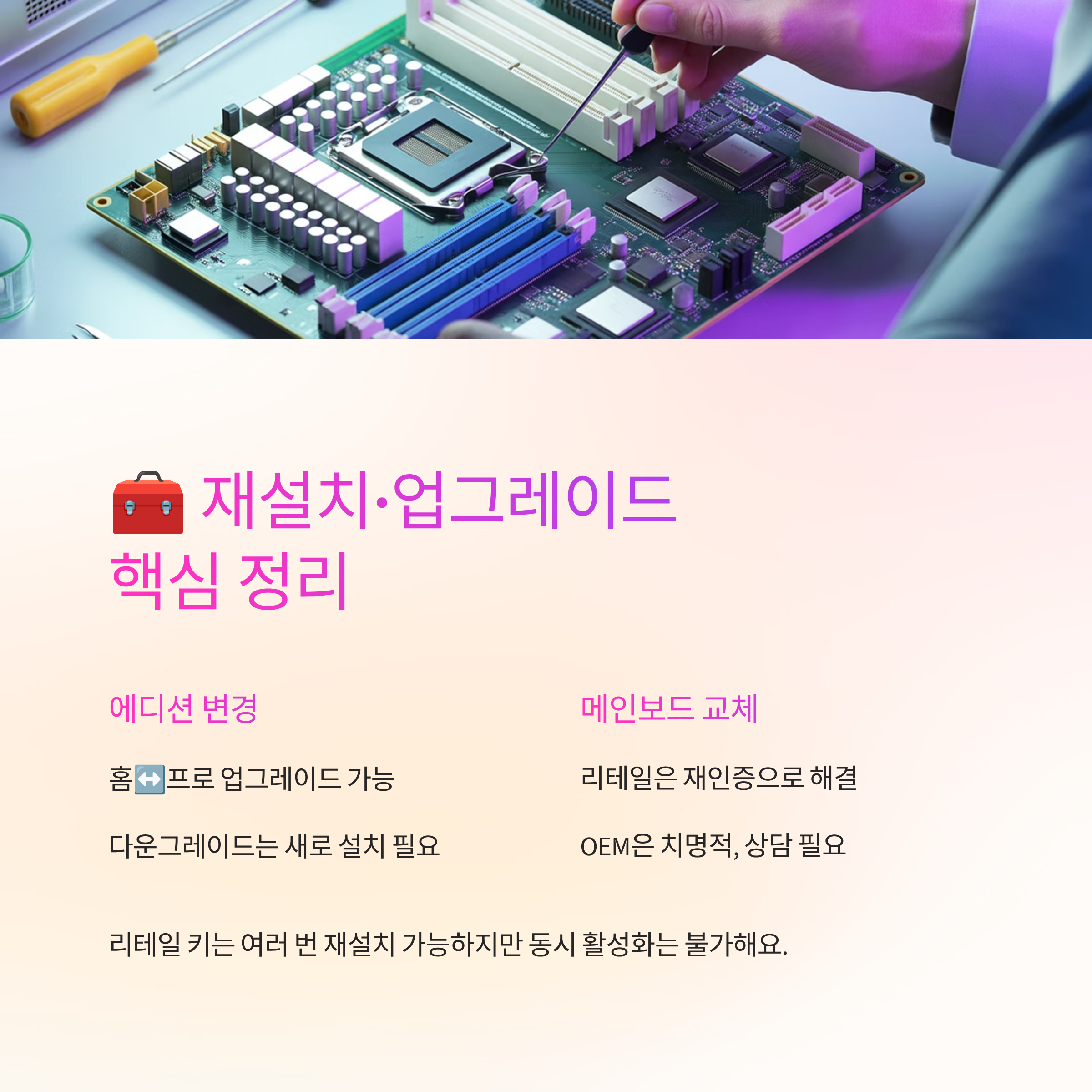 메인보드 교체는 OEM에겐 치명적이지만 리테일은 재인증 절차로 해결되는 경우가 많아요. 다만 너무 잦은 변경은 자동 인증이 실패할 수 있어 상담을 거치면 빨라요.