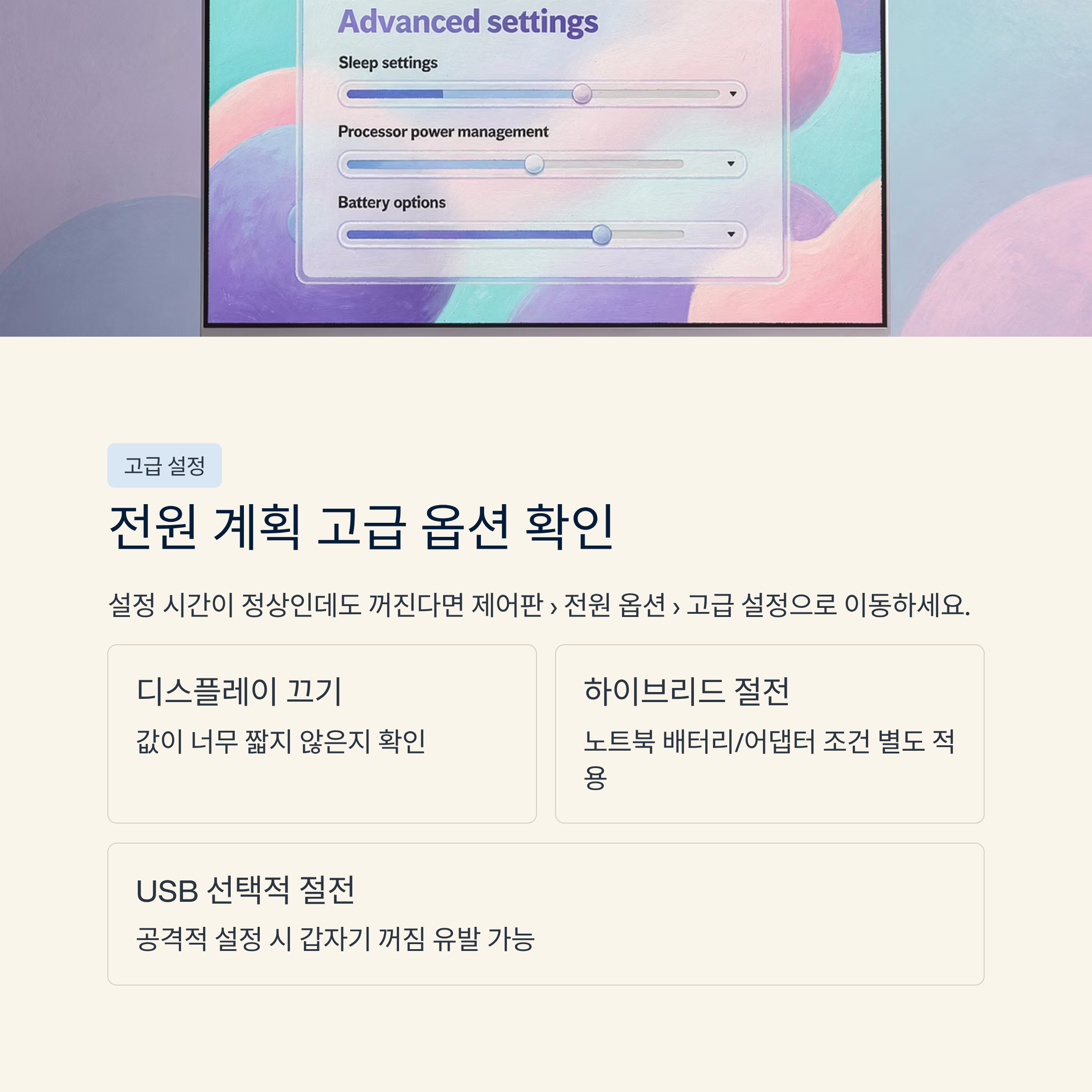 여기서 자주 확인하는 항목은 “디스플레이 끄기”, “절전 모드”, “하이브리드 절전”, “USB 선택적 절전” 같은 옵션이에요.