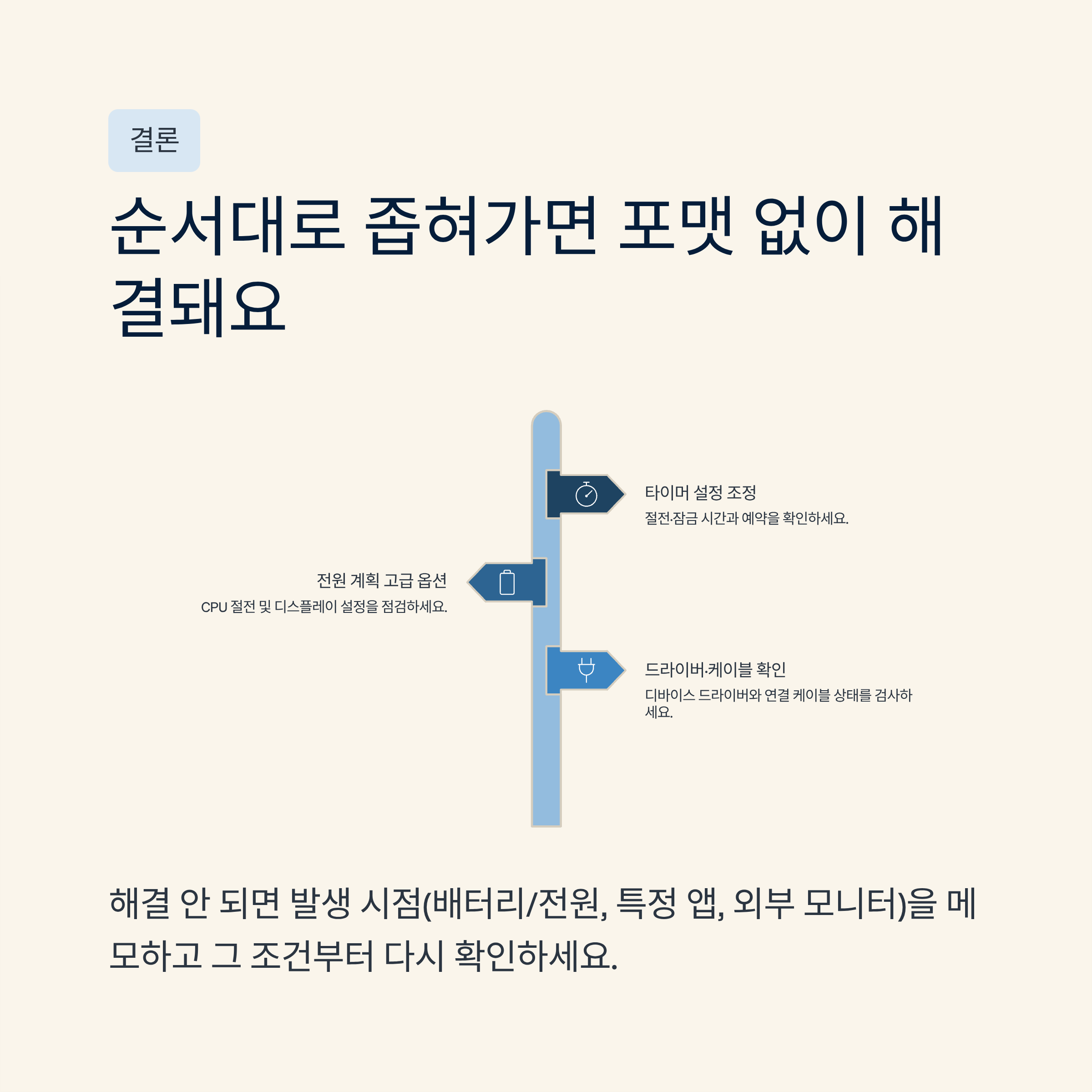 우선 디스플레이 끄기/절전 관련 옵션만 조정하고, 증상이 줄어들면 다음 단계로 넘어가면 원인 추적이 쉬워집니다.