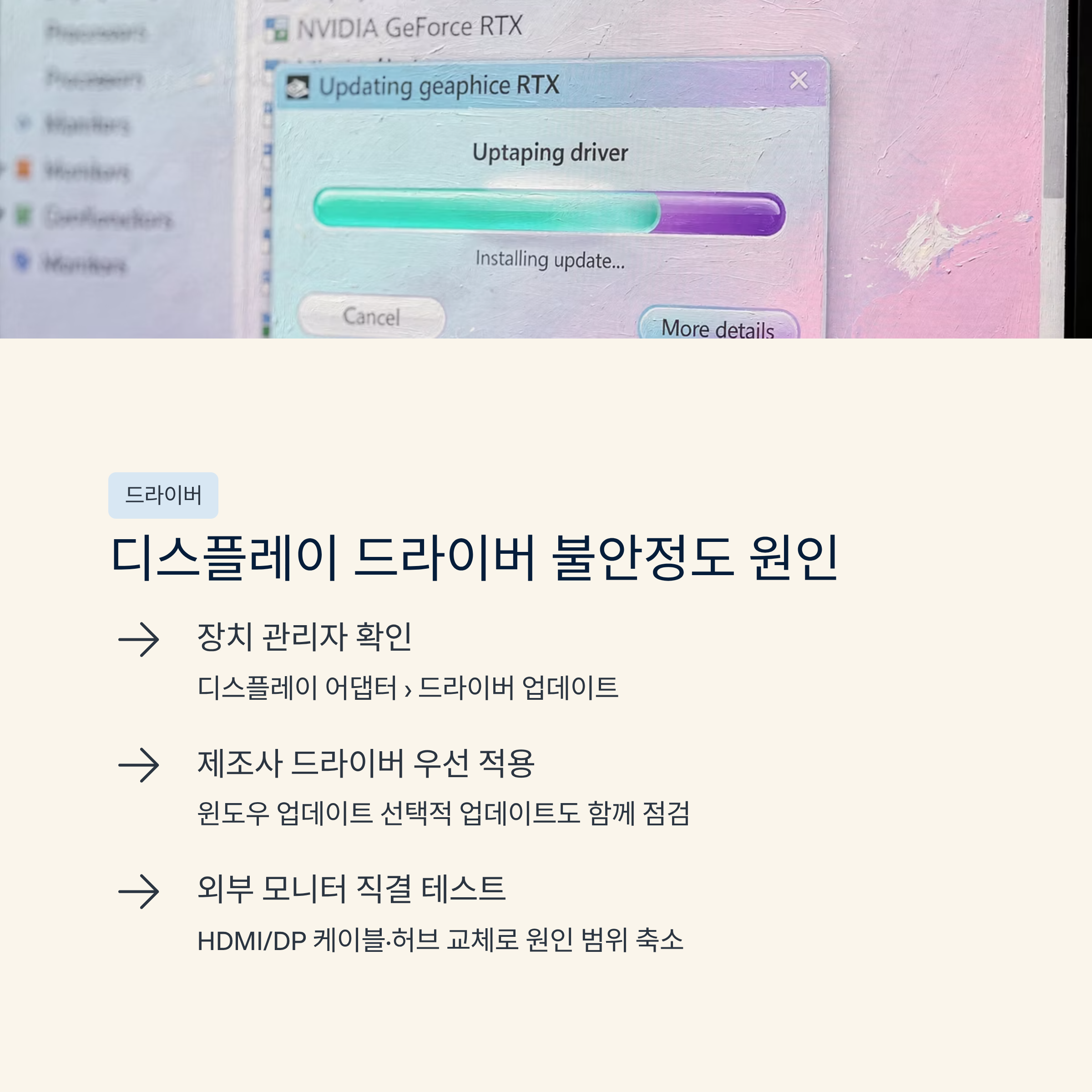 이럴 때는 디스플레이 어댑터 드라이버와 업데이트 상태를 같이 보는 게 좋아요.